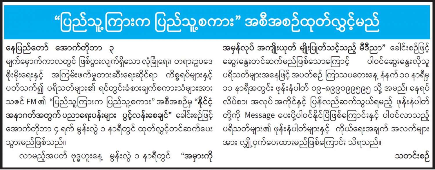 "ပြည်သူ့ကြားက ပြည်သူ့စကား" အစီအစဉ်ထုတ်လွှင့်မည်