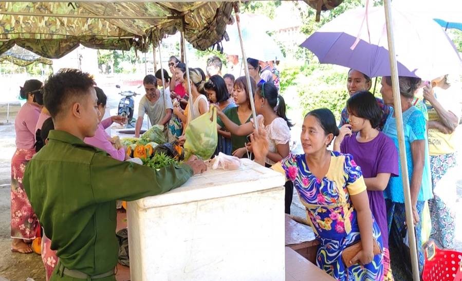 ဆိုင်ကလုန်းမုန်တိုင်း(မိုခါ)တိုက်ခတ်မှုကြောင့် မုန်တိုင်းဒဏ်သင့် ဒေသခံပြည်သူများနှင့် ဌာနဆိုင်ရာဝန်ထမ်းများ၏ စားသောက်ရေးအဆင်ပြေစေရန်နှင့် စားသောက်ကုန်ပစ္စည်းများကို ဈေးနှုန်းသက်သာစွာဖြင့် ဝယ်ယူစားသောက်နိုင်ရေးအတွက် အနောက်ပိုင်းတိုင်းစစ်ဌာနချုပ်၊ နယ်မြေခံတပ်မတော်သားများနှင့် တာဝန်ရှိသူများက နေ့စဉ်ရောင်းချပေးလျက်ရှိသည်။