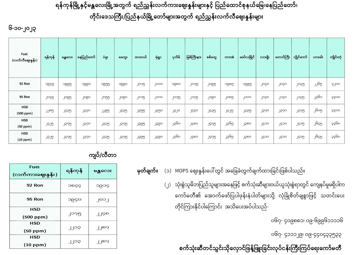 ရန်ကုန်မြို့နှင့် မန္တလေးမြို့အတွက် ရည်ညွှန်းလက်ကားဈေးနှုန်းများနှင့် ပြည်ထောင်စုနယ်မြေ နေပြည်တော်၊ တိုင်းဒေသကြီး/ ပြည်နယ် မြို့တော်များအတွက် ရည်ညွှန်းလက်လီဈေးနှုန်းများ 10/06/2023