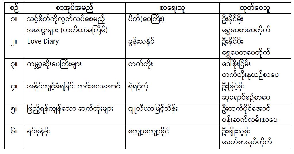 ပုံနှိပ်ခြင်းနှင့်ထုတ်ဝေခြင်းလုပ်ငန်းဥပဒေအရ ထုတ်ဝေသူသည် မိမိထုတ်ဝေသာ ထုတ်ဝေစာ ၅ အုပ် သို့မဟုတ် ၅ စောင်ကို ဖြန့်ချိသည့်နေ့မှစ၍ ၁၄ ရက်အတွင်း ပုံစံ (၁၁)ဖြင့် ပြန်ကြားရေးဝန်ကြီးဌာန၊ ပြန်ကြားရေးနှင့်ပြည်သူ့ဆက်ဆံရေးဦးစီးဌာန၊ မူပိုင်ခွင့်နှင့်မှတ်ပုံတင်ဌာနခွဲသို့ ပေးပို့အပ်နှံရမည်ဖြစ်ပါသည်။ ယခုအခါ အောက်ဖော်ပြပါထုတ်ဝေသူ များသည် ပုံနှိပ်ခြင်းနှင့်ထုတ်ဝေခြင်းလုပ်ငန်း ဥပဒေနှင့်အညီ မူပိုင်ခွင့်နှင့်မှတ်ပုံတင်ဌာနခွဲသို့ ပေးပို့အပ်နှံရန် ပျက်ကွက်လျက်ရှိပါသဖြင့် အမြန်ဆုံးပေးအပ်နိုင်ပါရန် အသိပေး ကြေညာအပ်ပါသည်-