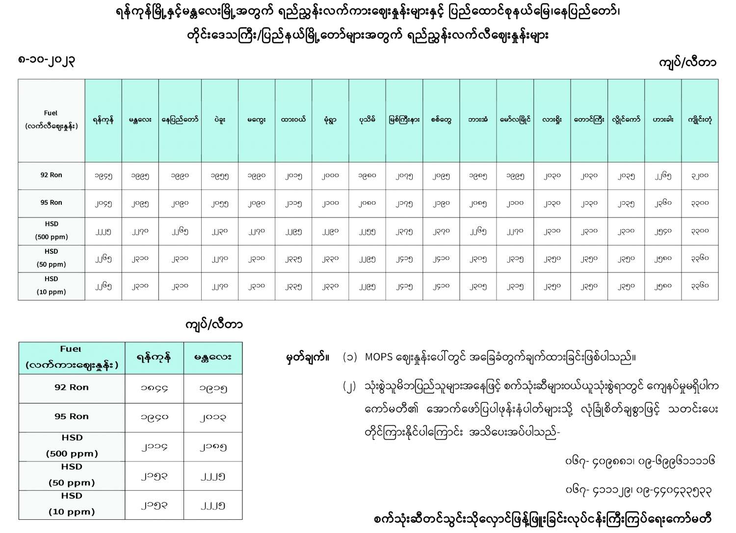 ရန်ကုန်မြို့နှင့်မန္တလေးမြို့အတွက် ရည်ညွှန်းလက်ကားဈေးနှုန်းများနှင့် ပြည်ထောင်စုနယ်မြေ နေပြည်တော်၊ တိုင်းဒေသကြီး/ပြည်နယ် မြို့တော်များအတွက် ရည်ညွှန်းလက်လီဈေးနှုန်းများ 10/08/2023