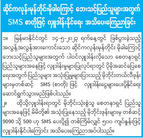 ဆိုင်ကလုန်းမုန်တိုင်းမိုခါကြောင့် ဘေးသင့်ပြည်သူများအတွက် SMS စာတိုဖြင့် လှူဒါန်းနိုင်ရေး အသိပေးကြေညာခြင်း 10/09/2023
