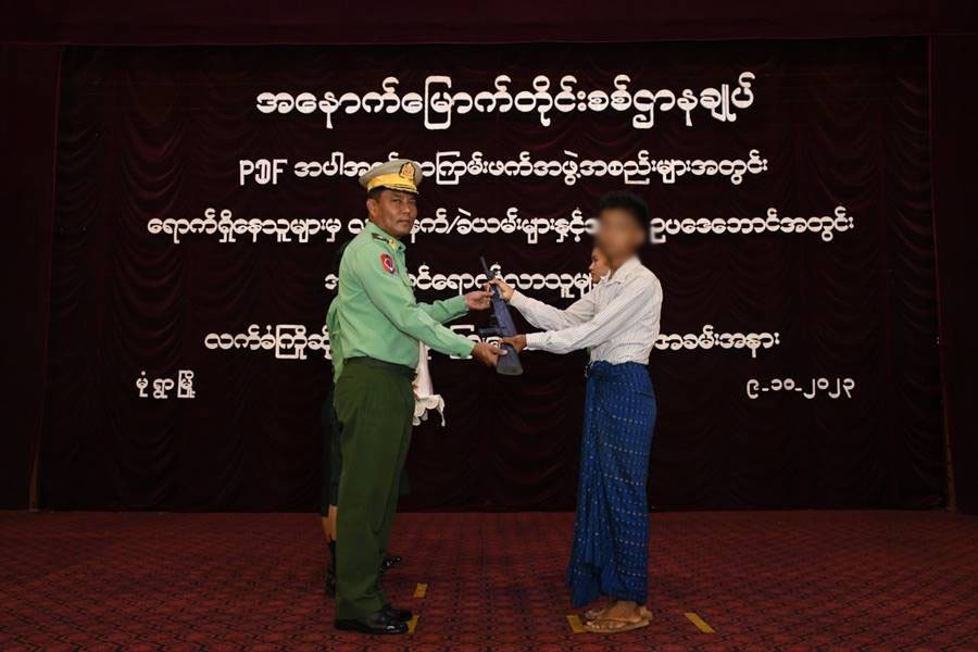 နိုင်ငံတော်စီမံအုပ်ချုပ်ရေးကောင်စီသည် PDF အပါအဝင် အဖွဲ့အစည်းအမျိုးမျိုးအမည်ခံ၍ လက်နက်ကိုင်ဆန့်ကျင်လျက်ရှိသည့် အဖွဲ့အစည်းများအတွင်း ရောက်ရှိနေသူများအား ဥပဒေဘောင်အတွင်းသို့ ပြန်လည်ဝင်ရောက်ရန်ဖိတ်ခေါ်၍ ဥပဒေဘောင်အတွင်းသို့ ဝင်ရောက်လာသူများကို လိုအပ်သည့်ကူညီပံ့ပိုးမှုများဆောင်ရွက်ပေးသွားမည်ဖြစ်ကြောင်းနှင့် လက်နက်/ခဲယမ်းများပါရှိမှုအတွက် ဆုကြေးငွေများပေးအပ်သွားမည်ဖြစ်ကြောင်း ထုတ်ပြန်ထားရှိပြီးဖြစ်ရာ ယနေ့တွင် ပြစ်မှုကျူးလွန်ခြင်းမရှိသော PDF အဖွဲ့မှ ဥပဒေဘောင်အတွင်းသို့ ပြန်လည်ဝင်ရောက်လာသူများအား မိဘအုပ်ထိန်းသူများထံ ပြန်လည်လွှဲပြောင်းပေးအပ်ခြင်းကို အနောက်မြောက်တိုင်းစစ်ဌာနချုပ်နှင့် စစ်ကိုင်းတိုင်းဒေသကြီး၊ တမူးမြို့နယ်၊ ကလေးမြို့နယ်နှင့် မုံရွာမြို့နယ်တို့ရှိ တပ်နယ်ခန်းမများ၌ အသီးသီးပြုလုပ်ကြရာ တိုင်းဒေသကြီးဝန်ကြီးချုပ်ဦးမြတ်ကျော်၊ တိုင်းမှူးဗိုလ်ချုပ်သန်းထိုက်နှင့် တာဝန်ရှိသူများ၊ ဌာနဆိုင်ရာတာဝန်ရှိသူများ၊ ဥပဒေဘောင်အတွင်း ပြန်လည်ဝင်ရောက်လာသူများနှင့် ၎င်းတို့၏ မိဘအုပ်ထိန်းသူများ တက်ရောက်ကြသည်။