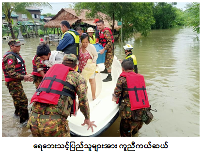 အလားတူ ရန်ကုန်တိုင်းဒေသကြီး၊ တိုက်ကြီးမြို့နယ်၊ ဥက္ကံမြို့၌ အောက်တိုဘာ ၈ ရက်တွင် မိုးသည်းထန်စွာရွာသွန်းခဲ့သဖြင့် ဥက္ကံချောင်းရေများ မြင့်တက်လာမှုကြောင့် အဆိုပါမြို့ရှိဥက္ကံရွာမကျေးရွာအုပ်စု၊ ရင်းတိုက်လေးပင်ကျေးရွာအုပ်စုနှင့် မင်းရဲကျော်စွာရပ်ကွက်တို့မှ ရေဘေးသင့်ပြည်သူများအား ရန်ကုန်တိုင်းစစ်ဌာနချုပ်၊ တိုက်ကြီးတပ်နယ်မှ နယ်မြေခံတပ်မတော်သားများက ရေဘေးကင်းလွတ်သည့်နေရာများသို့ ကူညီကယ်ဆယ်ရွှေ့ပြောင်းရေးလုပ်ငန်းများ ဆောင်ရွက်ပေးနေမှုများကို ယနေ့တွင် တိုက်ကြီးတပ်နယ်မှ တာဝန်ရှိသူများက သွားရောက်ကြည့်ရှုအားပေးပြီး စားသောက်ဖွယ်ရာများ ပေးအပ်ကာလိုအပ်သည်များ ညှိနှိုင်းဆောင်ရွက်ပေးခဲ့ကြောင်း သတင်းရရှိသည်။