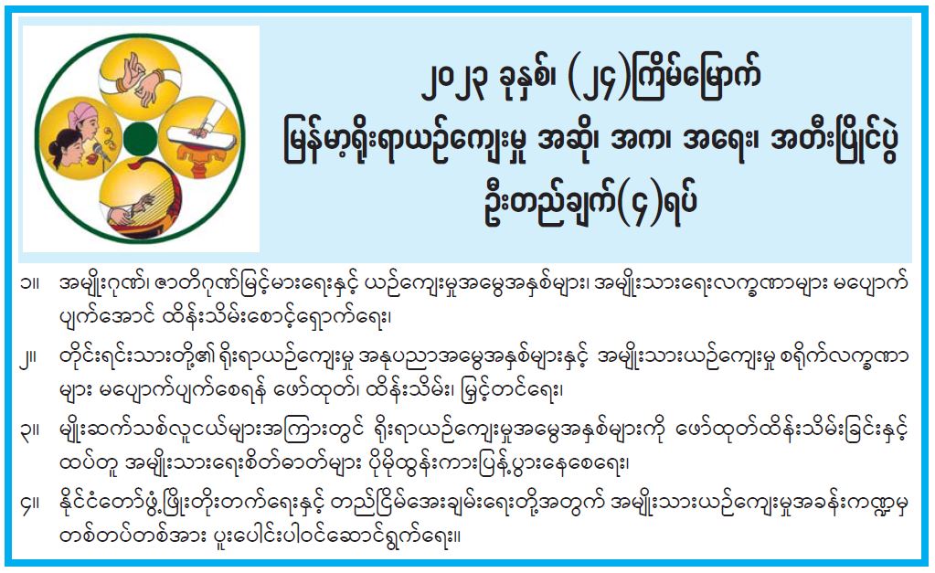 ၂၀၂၃ ခုနှစ်၊ (၂၄) ကြိမ်မြောက် မြန်မာ့ရိုးရာယဉ်ကျေးမှု အဆို၊ အက၊ အရေး၊ အတီးပြိုင်ပွဲ ဦးတည်ချက်(၄) ရပ် 10/10/2023