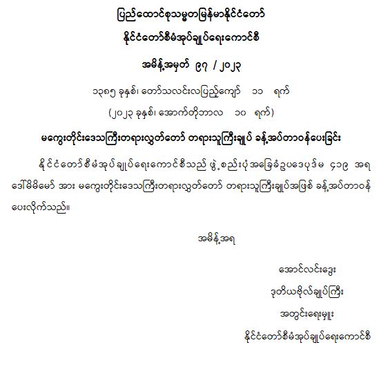 မကွေးတိုင်းဒေသကြီးတရားလွှတ်တော် တရားသူကြီးချုပ် ခန့်အပ်တာဝန်ပေးခြင်း