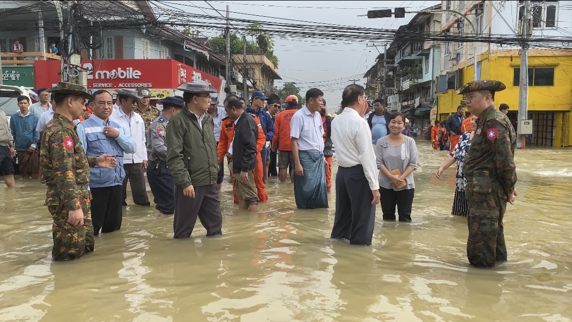 ထို့နောက် ပဲခူးတိုင်းဒေသကြီးအစိုးရအဖွဲ့၊ ဝန်ကြီးချုပ် ဦးမျိုးဆွေဝင်း၊ တောင်ပိုင်းတိုင်းစစ်ဌာနချုပ်တိုင်းမှူး ဗိုလ်မှူးချုပ် ကြည်သိုက်၊ လူမှုဝန်ထမ်းကယ်ဆယ်ရေးနှင့် ပြန်လည်နေရာချထားရေးဝန်ကြီးဌာန၊ ဒုတိယဝန်ကြီး ဦးစိုးကြည်တို့နှင့်အတူ ရေဝင်ရောက်လျက်ရှိသည့် ပဲခူးမြို့၊ မဂ္ဂတစ်လမ်းမဘေးတစ်လျောက်ရှိ ပုဏ္ဏားစုရပ်ကွက်နှင့် မှော်ကန်ရပ်ကွက်များအတွင်း စက်လှေများဖြင့် လှည့်လည်ကြည့်ရှုခဲ့ကြသည်။ ၎င်းနောက် တိုင်းဒေသကြီးဝန်ကြီးချုပ် ဦးမျိုးဆွေဝင်းနှင့် ဒုတိယဝန်ကြီးတို့သည် ရေဝင်ရောက်သည့် ရပ်ကွက်များအတွက် ရေသန့်ဗူးနှင့် ရေသန့်ဆေးပြားများ ထောက်ပံ့ပေးအပ်ခဲ့သည်။