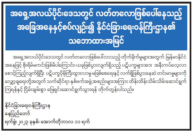 အရှေ့အလယ်ပိုင်းဒေသတွင် လတ်တလောဖြစ်ပေါ်နေသည့် အခြေအနေနှင့်စပ်လျဉ်း၍ နိုင်ငံခြားရေးဝန်ကြီးဌာန၏ သဘောထားအမြင် 10/11/2023