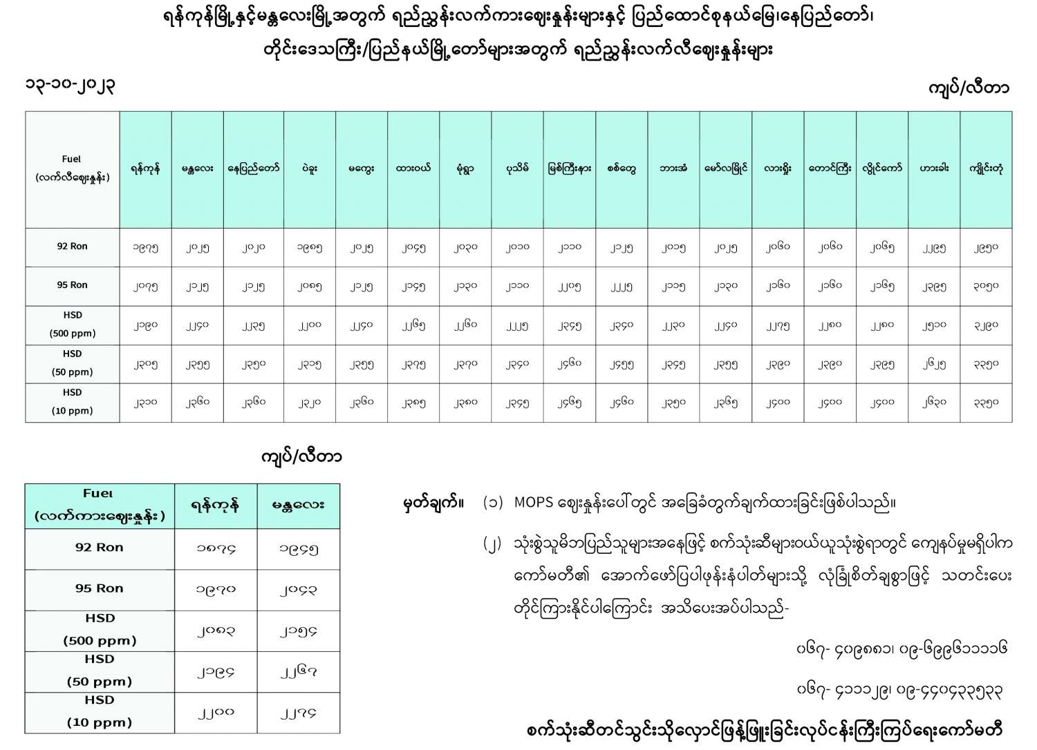 ရန်ကုန်နှင့်မန္တလေးမြို့အတွက် ရည်ညွှန်းလက်ကားဈေးနှုန်းများနှင့် ပြည်ထောင်စုနယ်မြေ နေပြည်တော်၊ တိုင်းဒေသကြီး/ ပြည်နယ် မြို့တော်များအတွက် ရည်ညွှန်းလက်လက်လီဈေးနှုန်းများ 10/13/2023