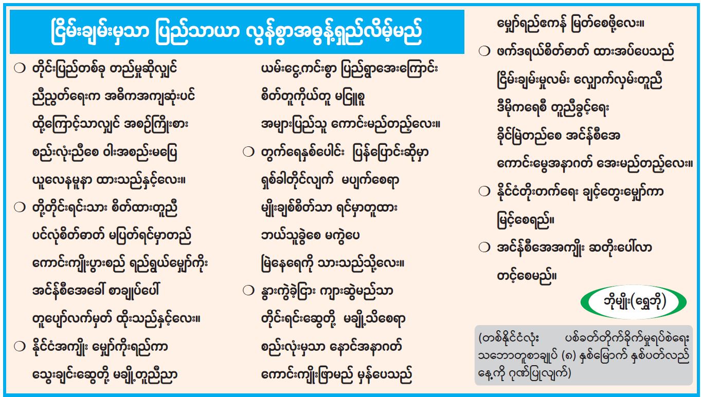 ငြိမ်းချမ်းမှသာ ပြည်သာယာ လွန်စွာအဓွန့်ရှည်လိမ့်မည်