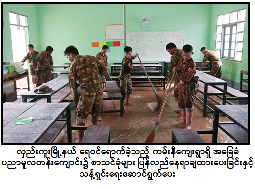 အလားတူ လှည်းကူးမြို့နယ်အတွင်း မိုးသည်းထန်စွာရွာသွန်းမှုကြောင့် ကြာအင်းကျေးရွာရှိ ဇေတဝန်ကျောင်းတိုက်၊ ကြို့ကုန်းကျေးရွာရှိ အခြေခံပညာမူလတန်းကျောင်းနှင့် ကမ်းနီကျေးရွာရှိ အခြေခံပညာမူလတန်းကျောင်းများအတွင်းသို့ ရေဝင်ရောက်မှုများဖြစ်ပေါ်ခဲ့ပြီး ယခုအခါ ရေများပြန်လည်ကျဆင်းသွားပြီဖြစ်ရာ ယနေ့ နံနက်ပိုင်းတွင် အင်းတိုင်တပ်နယ်မှ နယ်မြေခံ တပ်မတော်သားများက ကျောင်းဝန်းများအတွင်း/အပြင်ရှိ တင်ကျန်ခဲ့သော နုံးများနှင့် အမှိုက်များအား ဖယ်ရှားရှင်းလင်းပေးခြင်း၊ စာသင်ခုံများအား ပြန်လည်နေရာချထားပေးခြင်းနှင့် လိုအပ်သည့် သန့်ရှင်းရေးလုပ်ငန်းများ ဆောင်ရွက်ပေးခဲ့ကြောင်း သတင်းရရှိသည်။