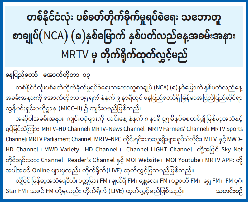တစ်နိုင်ငံလုံး ပစ်ခတ်တိုက်ခိုက်မှု ရပ်စဲရေး သဘောတူစာချုပ် (NCA) (၈)နှစ်မြောက် နှစ်ပတ်လည်နေ့အခမ်းအနား MRTV မှ တိုက်ရိုက်ထုတ်လွှင့်မည် 10/14/2023 တစ်နိုင်ငံလုံး ပစ်ခတ်တိုက်ခိုက်မှု ရပ်စဲရေး သဘောတူစာချုပ် (NCA) (၈)နှစ်မြောက် နှစ်ပတ်လည်နေ့အခမ်းအနား MRTV မှ တိုက်ရိုက်ထုတ်လွှင့်မည်