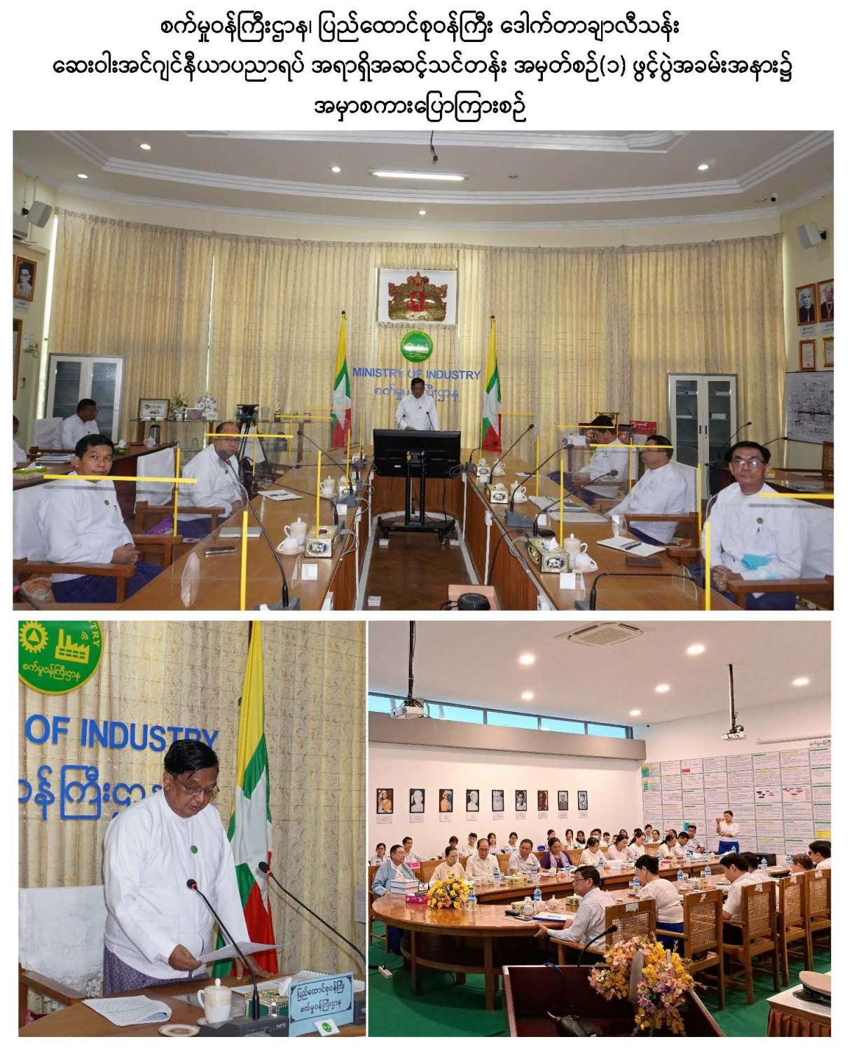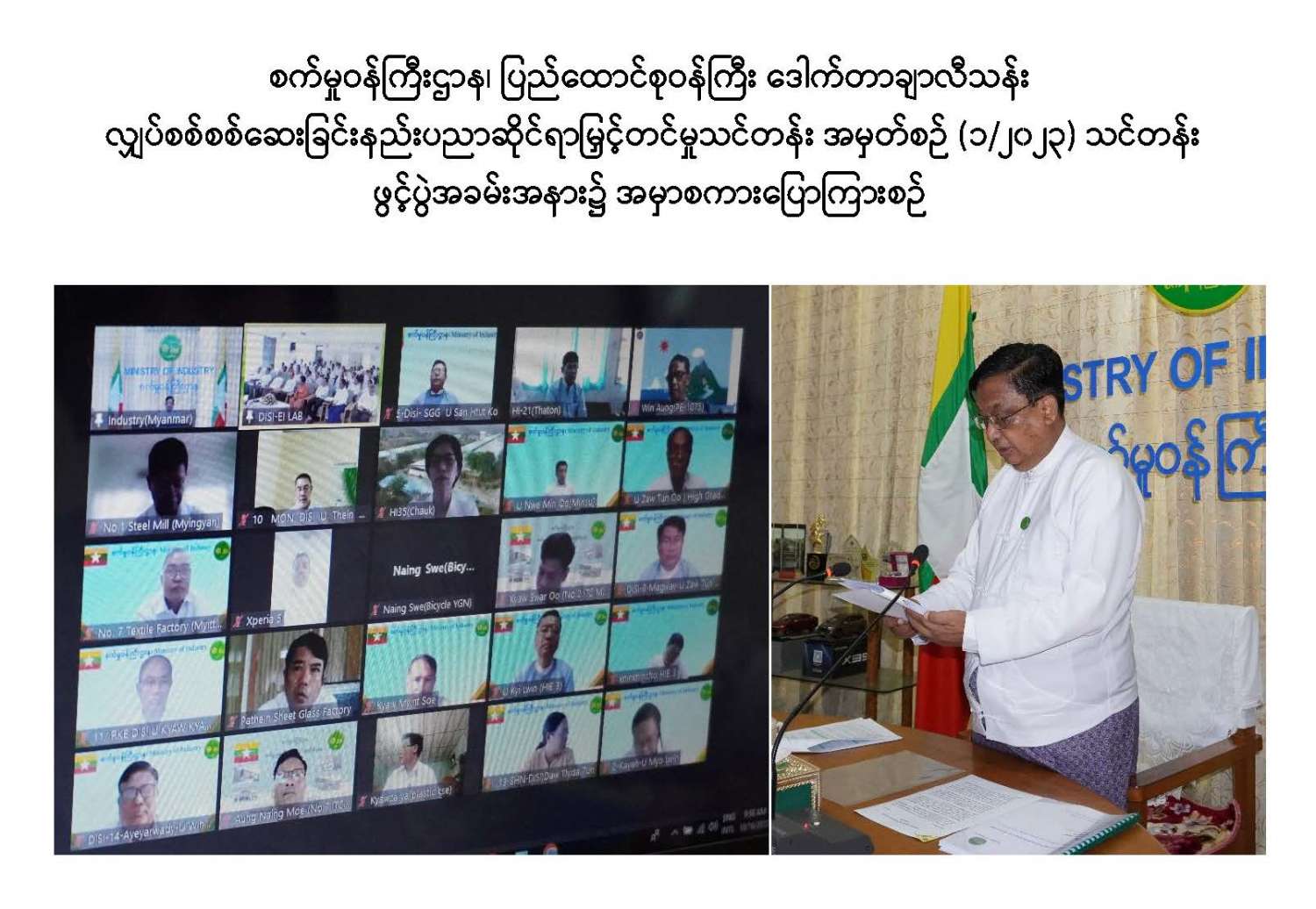 ဆေးဝါးအင်ဂျင်နီယာပညာရပ် အရာရှိအဆင့်သင်တန်း အမှတ်စဉ်(၁) (Pharmaceutical Engineering Training Course Level-1) ဖွင့်ပွဲအခမ်းအနားကို ယနေ့နံနက်ပိုင်းတွင် ရန်ကုန်တိုင်းဒေသကြီး အင်းစိန်မြို့နယ်ရှိ မြန်မာ့ဆေးဝါးစက်ရုံ(အင်းစိန်) ဆေးဝါးသမိုင်းပြခန်း၌ ကျင်းပရာ စက်မှုဝန်ကြီးဌာန ပြည်ထောင်စုဝန်ကြီး ဒေါက်တာချာလီသန်းနှင့် တာဝန်ရှိသူများ Virtual စနစ်ဖြင့် တက်ရောက်ကြသည်။