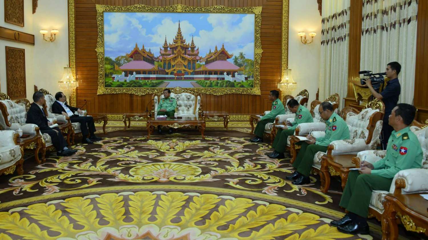 နိုင်ငံတော်စီမံအုပ်ချုပ်ရေးကောင်စီဥက္ကဋ္ဌ တပ်မတော်ကာကွယ်ရေးဦးစီးချုပ် ဗိုလ်ချုပ်မှူးကြီးမင်းအောင်လှိုင်အား တစ်နိုင်ငံလုံးပစ်ခတ်တိုက်ခိုက်မှုရပ်စဲရေး သဘောတူစာချုပ်(NCA) (၈)နှစ်မြောက်နှစ်ပတ်လည်နေ့အခမ်းအနားသို့ တက်ရောက်ခဲ့သော သျှမ်းပြည်ပြန်လည်ထူထောင်ရေးကောင်စီ(RCSS)ဥက္ကဋ္ဌ ဗိုလ်ချုပ်ကြီးယွက်စစ် ဦးဆောင်သည့်အဖွဲ့က ယနေ့နံနက်ပိုင်းတွင် နေပြည်တော်ရှိ ဘုရင့်နောင်ရိပ်သာ၊ ဧည့်ခန်းမဆောင်၌ လာရောက်ဂါရဝပြုတွေ့ဆုံသည်။