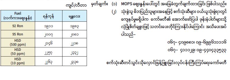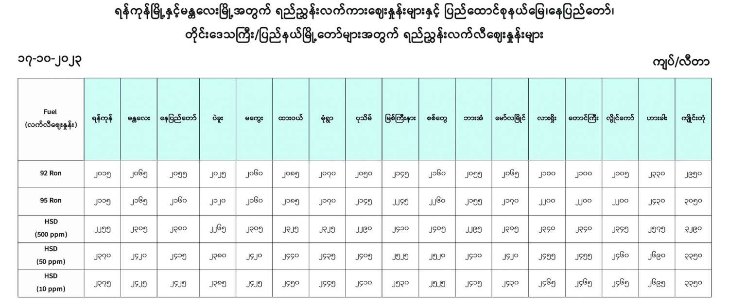 ရန်ကုန်မြို့နှင့်မန္တလေးမြို့အတွက် ရည်ညွှန်းလက်ကားဈေးနှုန်းများနှင့် ပြည်ထောင်စုနယ်မြေ နေပြည်တော်၊ တိုင်းဒေသကြီး/ပြည်နယ် မြို့တော်များအတွက် ရည်ညွှန်းလက်လီဈေးနှုန်းများ 10/18/2023