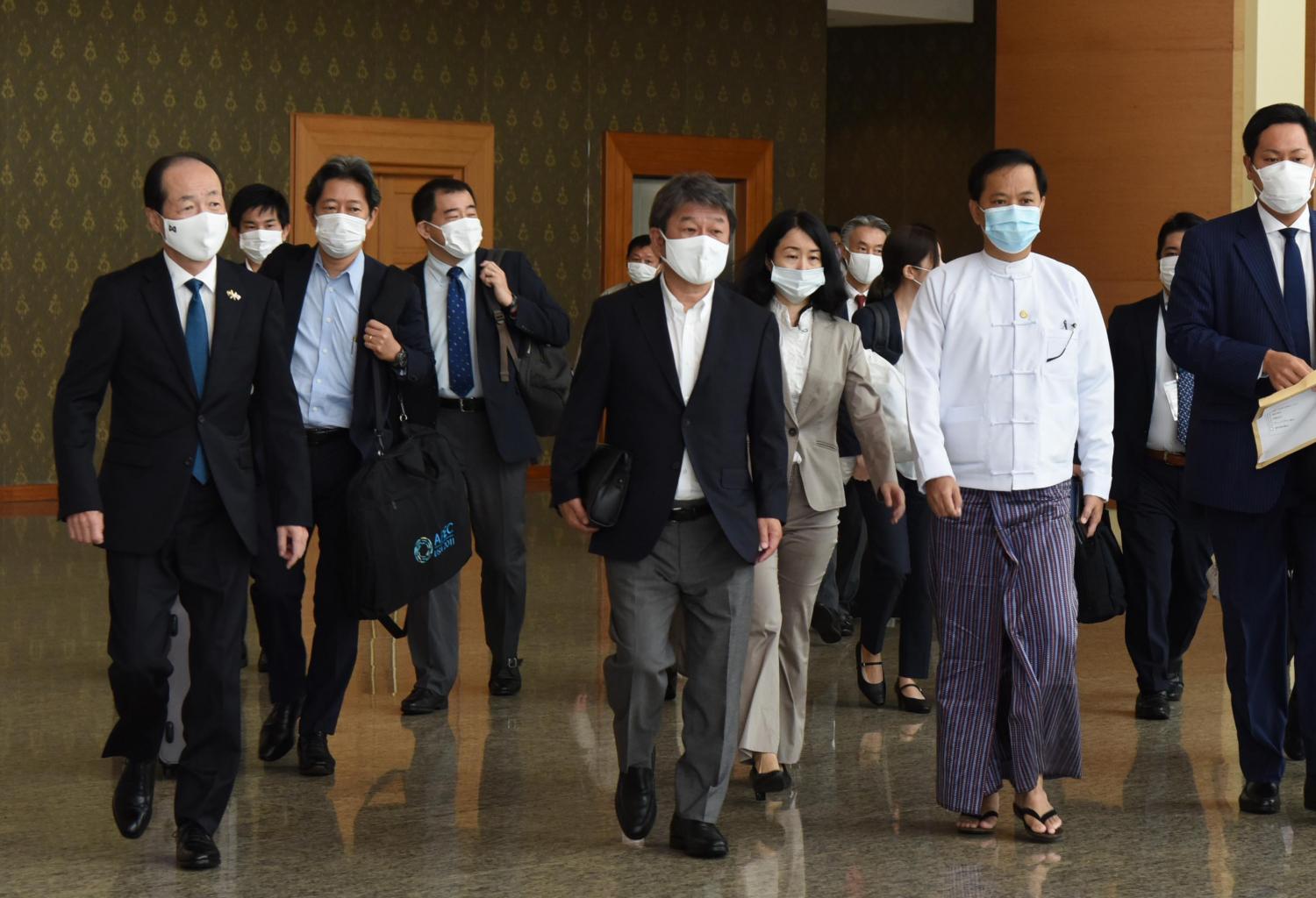 ဂျပန်နိုင်ငံခြားရေးဝန်ကြီး ဦးဆောင်သောအဖွဲ့အား နိုင်ငံခြားရေးဝန်ကြီးဌာန အမြဲတမ်းအတွင်းဝန် ဦးစိုးဟန်၊ မြန်မာနိုင်ငံဆိုင်ရာ ဂျပန်နိုင်ငံ သံအမတ်ကြီး မစ္စတာ အိချိရော့မာရုယာမနှင့် တာဝန်ရှိသူများက နေပြည်တော်အပြည်ပြည်ဆိုင်ရာ လေဆိပ်၌ ကြိုဆိုနှုတ်ဆက် ကြသည်။