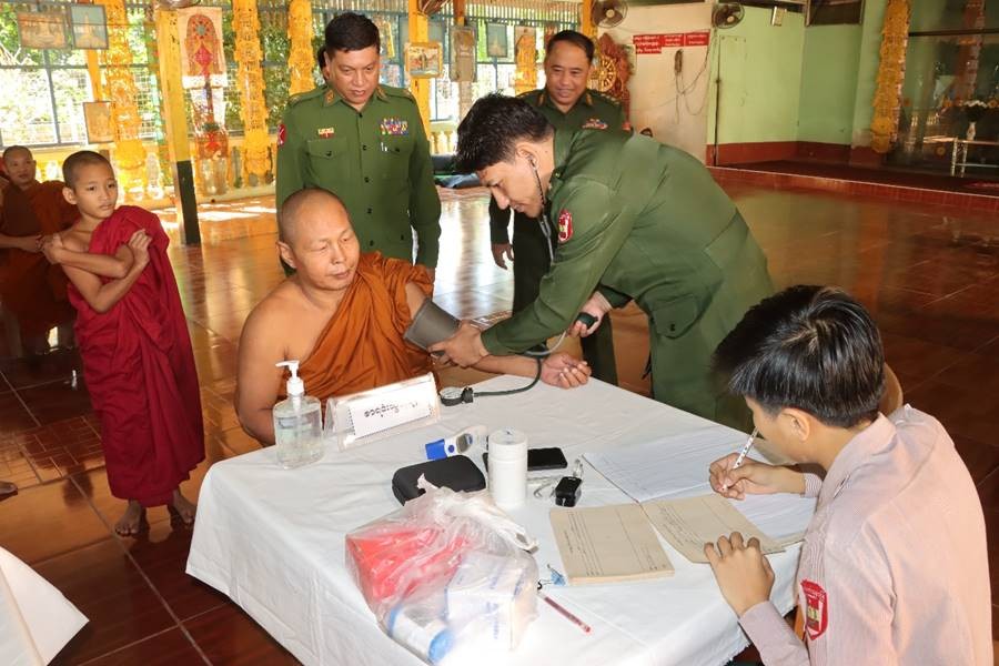 တိုင်းဒေသကြီးနှင့် ပြည်နယ်များအတွင်းရှိ မြို့နယ်များမှ သံဃာတော်များ၊ သာသနာနွယ်ဝင်သီလရှင်များ၊ ဒေသခံပြည်သူများအား သက်ဆိုင်ရာ တိုင်းစစ်ဌာနချုပ်အသီးသီမှ နယ်မြေခံဆေးကုသရေးအဖွဲ့များက လိုအပ်သည့် ကျန်းမာရေးစောင့်ရှောက်မှုလုပ်ငန်းများ ဆောင်ရွက်ပေးလျက်ရှိရာ ယနေ့တွင် မြောက်ပိုင်းတိုင်းစစ်ဌာနချုပ်၊ နယ်မြေခံဆေးကုသရေးအဖွဲ့က ကချင်ပြည်နယ်၊ မြစ်ကြီးနားမြို့ပေါ်ကျောင်းတိုက်များမှ သံဃာတော် ၅၃ ပါးတို့ကိုလည်းကောင်း၊ အရှေ့မြောက်တိုင်းစစ်ဌာနချုပ်၊ နယ်မြေခံဆေးကုသရေးအဖွဲ့က ရှမ်းပြည်နယ်(မြောက်ပိုင်း)၊ လားရှိုးမြို့၊ အမှတ်(၁၀)ရပ်ကွက်ရှိ တောရကျောင်းပရိယတ္တိစာသင်တိုက်မှ သံဃာတော် ၈၉ ပါးတို့ကိုလည်းကောင်း၊ တောင်ပိုင်းတိုင်းစစ်ဌာနချုပ်၊ နယ်မြေခံဆေးကုသရေးအဖွဲ့က ပဲခူးတိုင်းဒေသကြီး၊ ပြည်မြို့၊ နဝင်းရပ်ကွက်ရှိ ဝင်္ကဘာတောရဘုန်းတော်ကြီးကျောင်းတိုက်မှ သံဃာတော် ၄၇ ပါးတို့ကိုလည်းကောင်း သတ်မှတ်နေရာအသီးသီး၌ လိုအပ်သည့် ကျန်းမာရေးစစ်ဆေးကုသပေးခြင်းများ ဆောင်ရွက်ပေးသည်။
