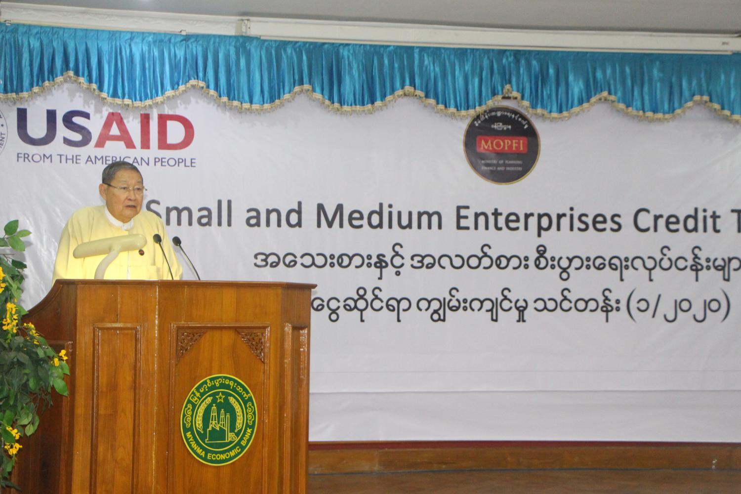 သင်တန်းဖွင့်ပွဲအခမ်းအနားတွင် စီမံကိန်း၊ ဘဏ္ဍာရေးနှင့် စက်မှုဝန်ကြီးဌာန၊ ပြည်ထောင်စုဝန်ကြီး ဦးစိုးဝင်းက ယခုဖွင့်လှစ်မည့် သင်တန်းတွင် စီမံကိန်း၊ ဘဏ္ဍာရေးနှင့် စက်မှုဝန်ကြီးဌာနနှင့် USAID တို့အကြား လက်မှတ် ရေးထိုးခဲ့သည့် နားလည်မှုစာချွန်လွှာ (MoU) အရ USAID ACDI/VOCA မှ ကူညီပေးသည့် သင်တန်းအစီ အစဉ်ဖြစ်ပါကြောင်း၊ နိုင်ငံပိုင် ကူးသန်းရောင်းဝယ်ရေးဘဏ် ရှေ့ပြေးစီမံကိန်း (Pilot Project) မှ စိုက်ပျိုးရေး၊ မွေးမြူရေးနှင့် အသေးစား၊ အလတ်စား စီးပွားရေးလုပ်ငန်းများသို့ နှစ်တိုချေးငွေထုတ်ချေးမည့် လုပ်ငန်းစဉ်မှာ အထူးအရေးပါပါကြောင်း၊ ချေးငွေများထုတ်ချေးရာတွင် အပေါင်ပစ္စည်းကို အာမခံထား၍ သမားရိုးကျ ထုတ်ချေးသည့် နည်းလမ်းထက် SMEs လုပ်ငန်းရှင်များအား Business အခြေခံသည့် Cash-flow Based Financing Model အသုံးပြု၍ ချေးငွေအမျိုး အစားသစ်များ ထုတ်ချေးနိုင်ရေး ဝန်ထမ်းများ၏ အရည်အသွေးမြှင့်တင်ရန် လိုအပ်သည့်အတွက် ယခုကဲ့သို့ သင်တန်းဖွင့်လှစ်ရခြင်းဖြစ်ပါကြောင်း ပြောကြားသည်။