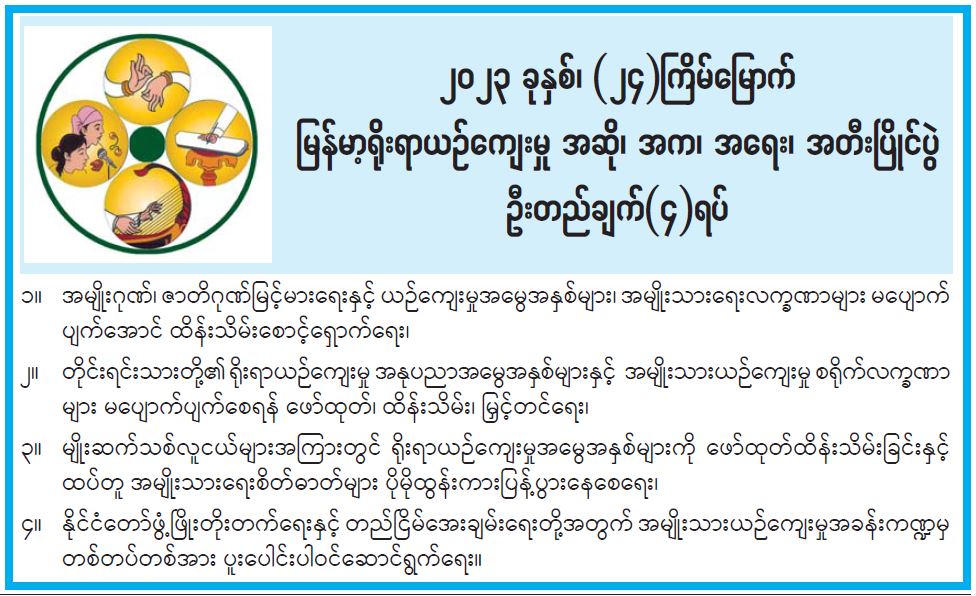 ၂၀၂၃ ခုနှစ်၊ (၂၄) ကြိမ်မြောက် မြန်မာ့ရိုးရာယဉ်ကျေးမှု အဆို၊ အက၊ အရေး၊ အတီး ပြိုင်ပွဲ ဦးတည်ချက်(၄)ရပ် 10/20/2023