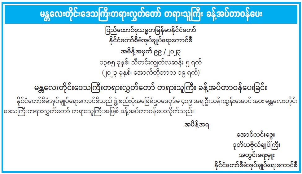 မန္တလေးတိုင်းဒေသကြီးတရားလွှတ်တော် တရားသူကြီး ခန့်အပ်တာဝန်ပေး