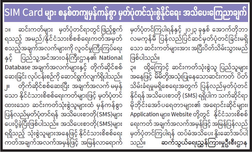 SIM Card များ စနစ်တကျမှန်ကန်စွာ မှတ်ပုံတင်သုံးစွဲနိုင်ရေး အသိပေးကြေညာချက်