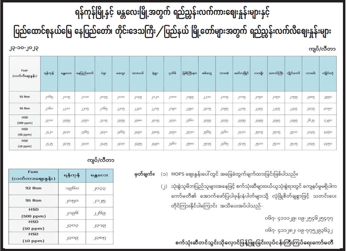 ရန်ကုန်မြို့နှင့် မန္တလေးမြို့အတွက် ရည်ညွှန်းလက်ကားဈေးနှုန်းများနှင့် ပြည်ထောင်စုနယ်မြေ နေပြည်တော်၊ တိုင်းဒေသကြီး/ပြည်နယ်မြို့တော်များအတွက် ရည်ညွှန်းလက်လီဈေးနှုန်းများ 10/23/2023