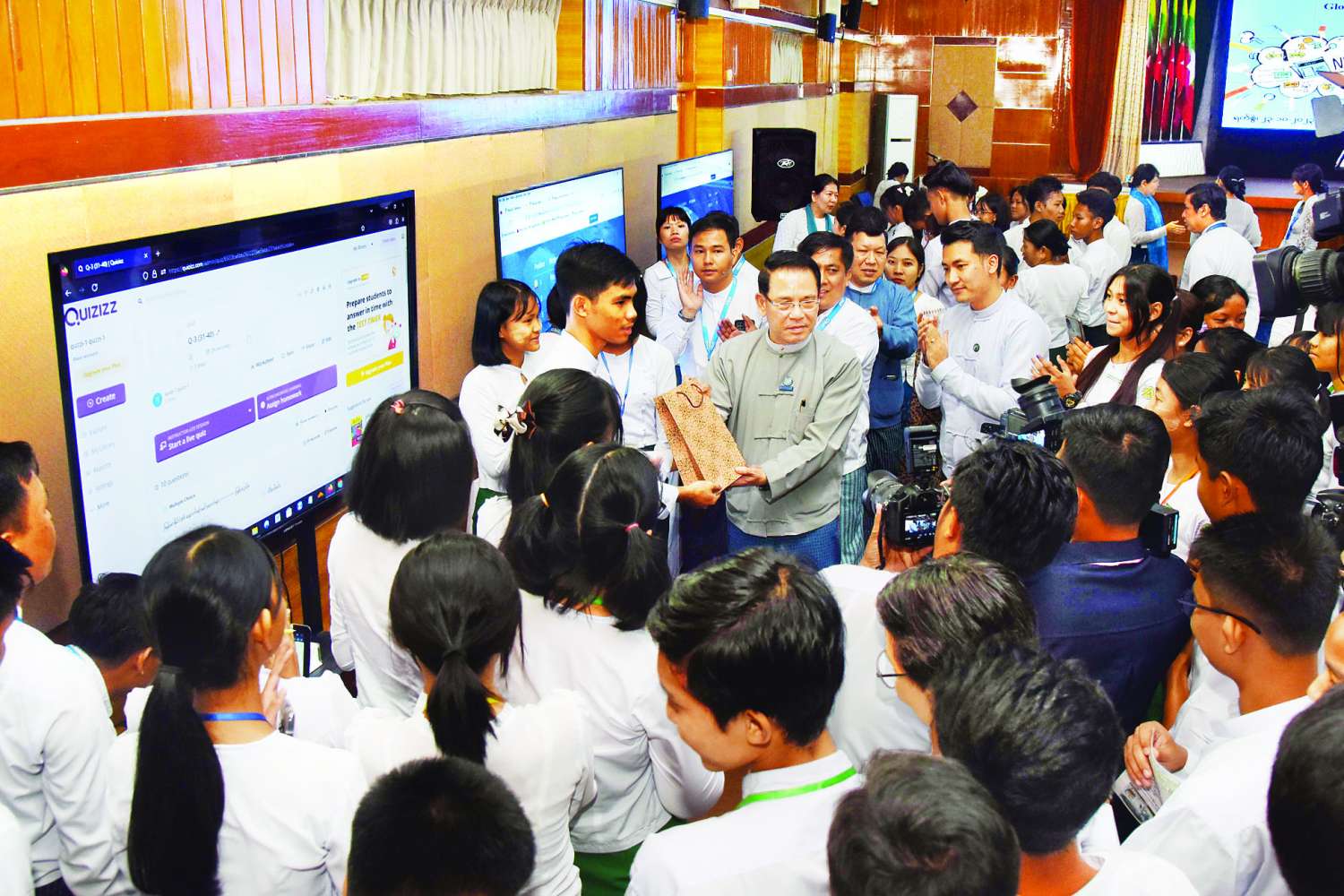 ဆက်လက်၍ ပြည်ထောင်စုဝန်ကြီးသည် ကျောင်းသား ကျောင်းသူများနှင့်အတူ သတင်းအချက်အလက်၊ အထွေထွေဗဟုသုတ အမေးအဖြေများအား အတူတကွ ဖြေဆိုဆောင်ရွက်ပြီး ဆုရရှိသူများအား အမှတ်တရဆုလက်ဆောင်များ ပေးအပ်ချီးမြှင့်ကာ ခင်းကျင်းပြသထားသော စာအုပ်စာတမ်းများ၊ ဂျာနယ်၊ သတင်းစာများကို လှည့်လည်ကြည့်ရှုသည်။