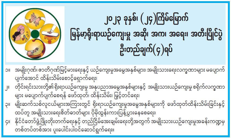 ၂၀၂၃ ခုနှစ်၊ (၂၄) ကြိမ်မြောက် မြန်မာ့ရိုးရာယဉ်ကျေးမှု အဆို၊ အက၊ အရေး၊ အတီး ပြိုင်ပွဲ ဦးတည်ချက် (၄)ရပ် 10/24/2023