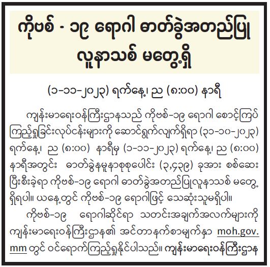 ကိုဗစ်-၁၉ ရောဂါ ဓာတ်ခွဲအတည်ပြု လူနာသစ် မတွေ့ရှိ