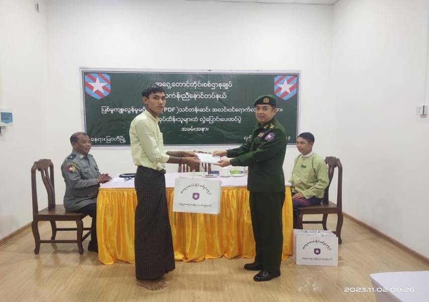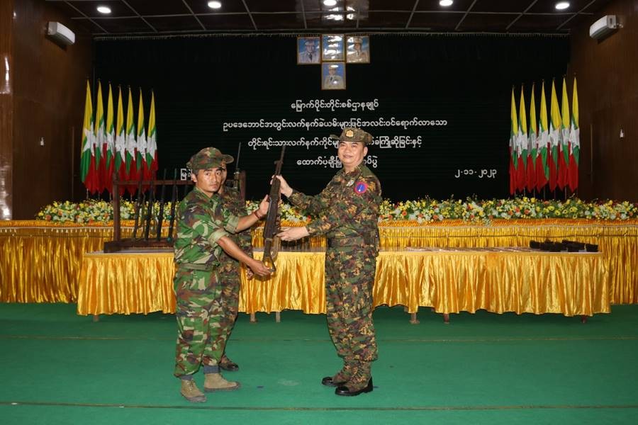 ဦးစွာ တိုင်းမှူးက နယ်မြေဒေသတည်ငြိမ်အေးချမ်းရေးနှင့် တရားဥပဒေဆိုင်ရာပုဒ်မများကို ရှင်းလင်းဆွေးနွေးပြောကြားသည်။ ထို့နောက် ဥပဒေဘောင်အတွင်း ပြန်လည်ဝင်ရောက်လာသည့် ပြစ်မှုကျူးလွန်ခြင်းမရှိသော KIA နှင့် PDF အဖွဲ့ဝင် ၁၀ ဦးတို့သည် ၎င်းတို့နှင့်အတူပါလာသည့် AK-47 (၄) လက်၊ KO လက်နက်ငယ် (၂) လက်၊ AK-47 (၄၀) တွဲ (၁) လက်၊ 79 (၂) လက်၊ စနိုက်ပါ (၁) လက်နှင့် ၅.၅၆ ကျည် ၄၅၀ တောင့်၊ ၇.၆၂ စနိုက်ပါကျည် ၁၅၀ တောင့်၊ ၄၀ မမ ဗုံးသီး (၂၉) လုံး၊ ကြိုးဆွဲလက်ပစ်ဗုံး (၁၆) လုံး၊ ကျည်အိမ်မျိုးစုံ ၂၇ ခုနှင့် ဆက်စပ်ပစ္စည်းများကိုအပ်နှံကြရာ တိုင်းမှူးနှင့် တာဝန်ရှိသူများကလက်ခံရယူကြပြီး ထောက်ပံ့ငွေစုစုပေါင်းငွေကျပ် ၁၆၅ သိန်းပေးအပ်သည်။ ထို့နောက် ဥပဒေဘောင်အတွင်း ဝင်ရောက်လာသူတစ်ဦးက လက်ခံရယူပြီး ကျေးဇူးတင်စကားပြန်လည်ပြောကြားကြောင်းနှင့် လက်နက်/ခဲယမ်းများအတွက် ဆုကြေးငွေများကို ဆက်လက်ချီးမြှင့်သွားမည်ဖြစ်ကြောင်း သိရှိရသည်။