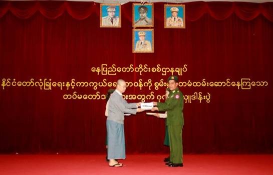 ထိုသို့ ပေးအပ်လျက်ရှိရာ ယနေ့တွင် နေပြည်တော်ကောင်စီနယ်မြေအတွင်းရှိ စေတနာရှင်အလှူရှင်များက ဂုဏ်ပြုချီးမြှင့်ငွေများပေးအပ်ခြင်းကို နေပြည်တော်တိုင်း စစ်ဌာနချုပ်ရှိ အောင်ငြိမ်းအေးခန်းမ၌ပြုလုပ်ရာ တိုင်းမှူး ဗိုလ်ချုပ် စောသန်းလှိုင်နှင့် တာဝန်ရှိသူများ၊ စေတနာရှင်အလှူရှင်များ တက်ရောက်ကြသည်။ ဦးစွာ စေတနာရှင်အလှူရှင်တစ်ဦးက ဂုဏ်ပြုချီးမြှင့်ငွေပေးအပ်ရခြင်းနှင့်ပတ်သက်၍ ရှင်းလင်းပြောကြားသည်။ ထို့နောက် စေတနာရှင်အလှူရှင် ၃၅ ဦးက ဂုဏ်ပြုချီးမြှင့်ငွေ စုစုပေါင်းငွေကျပ် ၂၁၉၈၄ သိန်းအားဂုဏ်ပြုပေးအပ်ရာ တိုင်းမှူးကလက်ခံရယူပြီး ကျေးဇူးတင်စကား ပြန်လည်ပြောကြားကာ ဂုဏ်ပြုမှတ်တမ်းလွှာများပေးအပ်သည်။