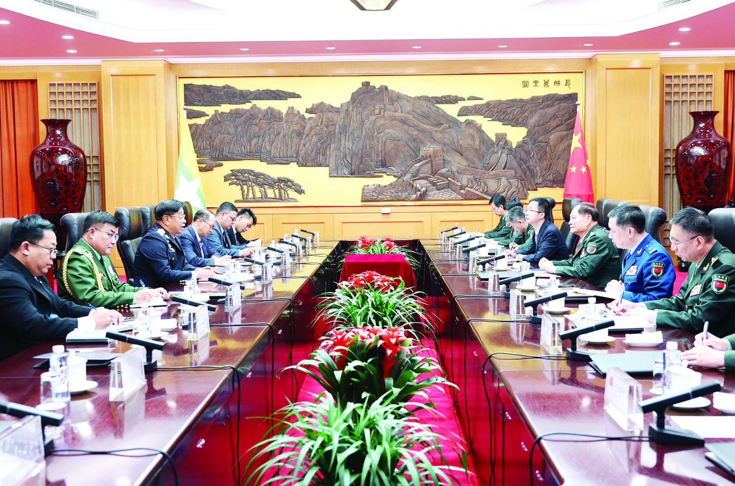 ဒုတိယဝန်ကြီးချုပ်နှင့် ပြည်ထောင်စုဝန်ကြီး ဗိုလ်ချုပ်ကြီး တင်အောင်စန်း ဦးဆောင်သော မြန်မာကိုယ်စားလှယ်အဖွဲ့သည် အောက်တိုဘာ ၂၉ ရက် နံနက် ၉ နာရီအချိန်တွင် တရုတ်ပြည်သူ့သမ္မတနိုင်ငံ၊ ဗဟိုစစ်ကော်မရှင် ဒုတိယဥက္ကဋ္ဌ ဗိုလ်ချုပ်ကြီး ကျန်းယိုရှားဦးဆောင်သော ကိုယ်စားလှယ်အဖွဲ့နှင့် နှစ်နိုင်ငံ သီးသန့်တွေ့ဆုံပွဲသို့ တက်ရောက်ခဲ့ပြီးတွေ့ဆုံပွဲ၌ ဗိုလ်ချုပ်ကြီး ကျန်းယိုရှားက တရုတ် - မြန်မာ ဆွေမျိုးပေါက်ဖော်ဆက်ဆံရေးသည် ယခင်ကထက် ပိုမိုတိုးတက် ခိုင်မာလာလျက်ရှိကြောင်း၊ မြန်မာနိုင်ငံ၏ ငြိမ်းချမ်းရေးလုပ်ငန်းစဉ် တိုးတက်လာစေရေးအတွက် တရုတ်နိုင်ငံအနေဖြင့် မြန်မာနိုင်ငံအား ကူညီပေးသွားမည်ဖြစ်ကြောင်း၊ နယ်စပ်ဒေသများတွင် လုံခြုံရေးနှင့် တည်ငြိမ်ရေးတို့အတွက် မြန်မာနိုင်ငံအနေဖြင့် တရုတ်နိုင်ငံနှင့်အတူ ဆောင်ရွက်သွားမည်ဟုလည်း မျှော်လင့်ပါကြောင်း၊ တရုတ်နိုင်ငံအနေဖြင့် မဟာဗျူဟာမြောက် အပြန်အလှန်ယုံကြည်မှုကို နက်ရှိုင်းအောင် ဆောင်ရွက်ရန်အသင့်ရှိကြောင်း၊ နယ်ပယ်အသီးသီး၌ လက်တွေ့ပူးပေါင်းဆောင်ရွက်မှုများကို အားကောင်းအောင် လုပ်ဆောင်ရေးနှင့် မြန်မာ့တပ်မတော်နှင့် အဆင့်မြင့်ဆက်ဆံရေးများကို ထိန်းသိမ်းထားရန်တို့အား လုပ်ဆောင်ရန် အသင့်ဖြစ်နေကြောင်း ပြောကြားခဲ့သည်။ ဒုတိယဝန်ကြီးချုပ်ကလည်း နှစ်နိုင်ငံတပ်မတော်ချင်း ဘက်စုံပူးပေါင်းဆောင်ရွက်မှုကို မြှင့်တင်ရန်အတွက် တရုတ်ပြည်သူ့လွတ်မြောက်ရေး တပ်မတော်နှင့်အတူ ဆက်လက်ဆောင်ရွက်သွားလိုပါကြောင်း၊ နှစ်နိုင်ငံနယ်စပ်ဒေသ တည်ငြိမ်အေးချမ်းရေးနှင့် တရားဥပဒေစိုးမိုးရေးအပေါ် မြန်မာ့တပ်မတော်အနေနှင့် အထူးအလေးထားပါကြောင်း၊ နယ်စပ်ဒေသတည်ငြိမ်ရေးအား ထိန်းသိမ်းထားနိုင်ရေးအတွက် နှစ်နိုင်ငံတပ်မတော်များအကြား အပြန်အလှန် သတင်းဖလှယ်ရေးကိုလည်း မြှင့်တင်လုပ်ဆောင်သွားမည်ဖြစ်ပါကြောင်း ပြောကြားသည်။