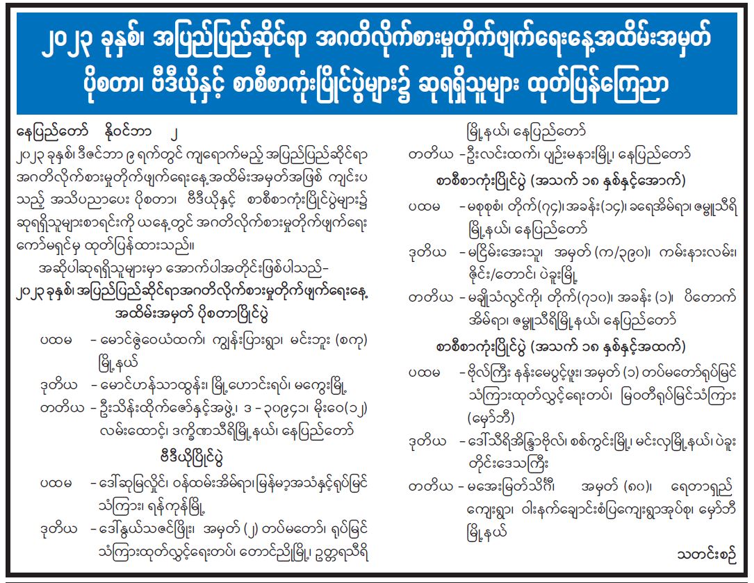 ၂၀၂၃ ခုနှစ်၊ အပြည်ပြည်ဆိုင်ရာ အဂတိလိုက်စားမှုတိုက်ဖျက်ရေးနေ့အထိမ်းအမှတ် ပိုစတာ၊ ဗီဒီယိုနှင့် စာစီစာကုံးပြိုင်ပွဲများ၌ ဆုရရှိသူများ ထုတ်ပြန်ကြေညာ 11/03/2023