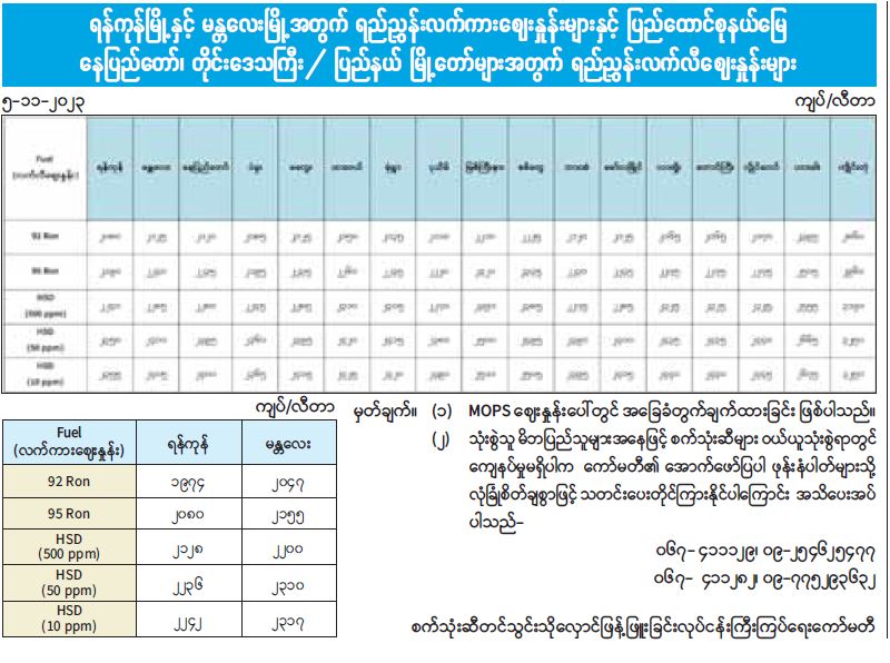 ရန်ကုန်မြို့နှင့် မန္တလေးမြို့အတွက် ရည်ညွှန်းလက်ကားဈေးနှုန်းများနှင့် ပြည်ထောင်စုနယ်မြေ နေပြည်တော်၊ တိုင်းဒေသကြီး/ ပြည်နယ် မြို့တော်များအတွက် ရည်ညွှန်းလက်လီဈေးနှုန်းများ 11/05/2023