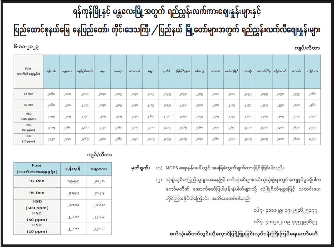 ရန်ကုန်မြို့နှင့် မန္တလေးမြို့အတွက် ရည်ညွှန်းလက်ကားဈေးနှုန်းများနှင့် ပြည်ထောင်စုနယ်မြေ နေပြည်တော်၊ တိုင်းဒေသကြီး/ပြည်နယ်မြို့တော်များအတွက် ရည်ညွှန်းလက်လီဈေးနှုန်းများ 11/06/2023