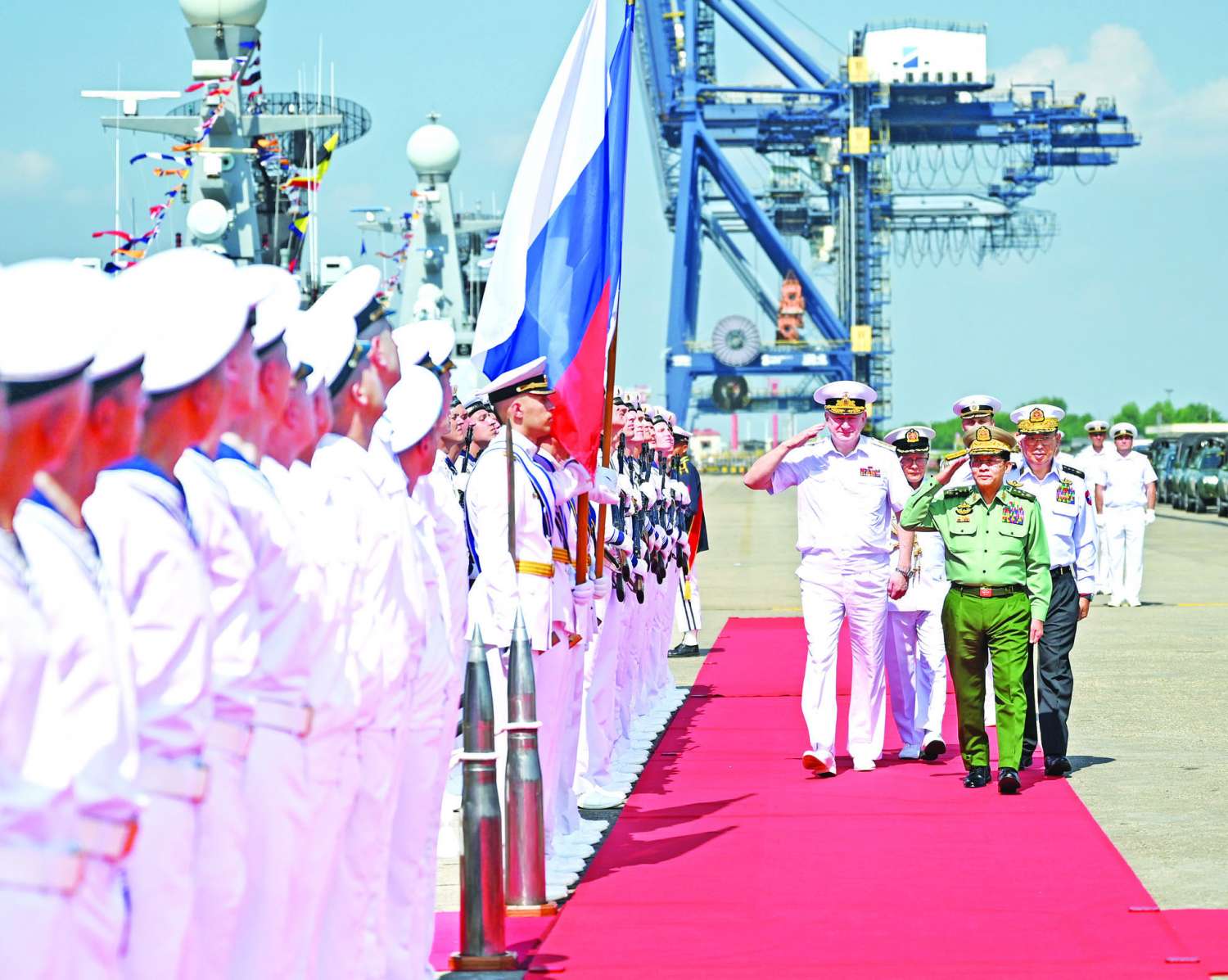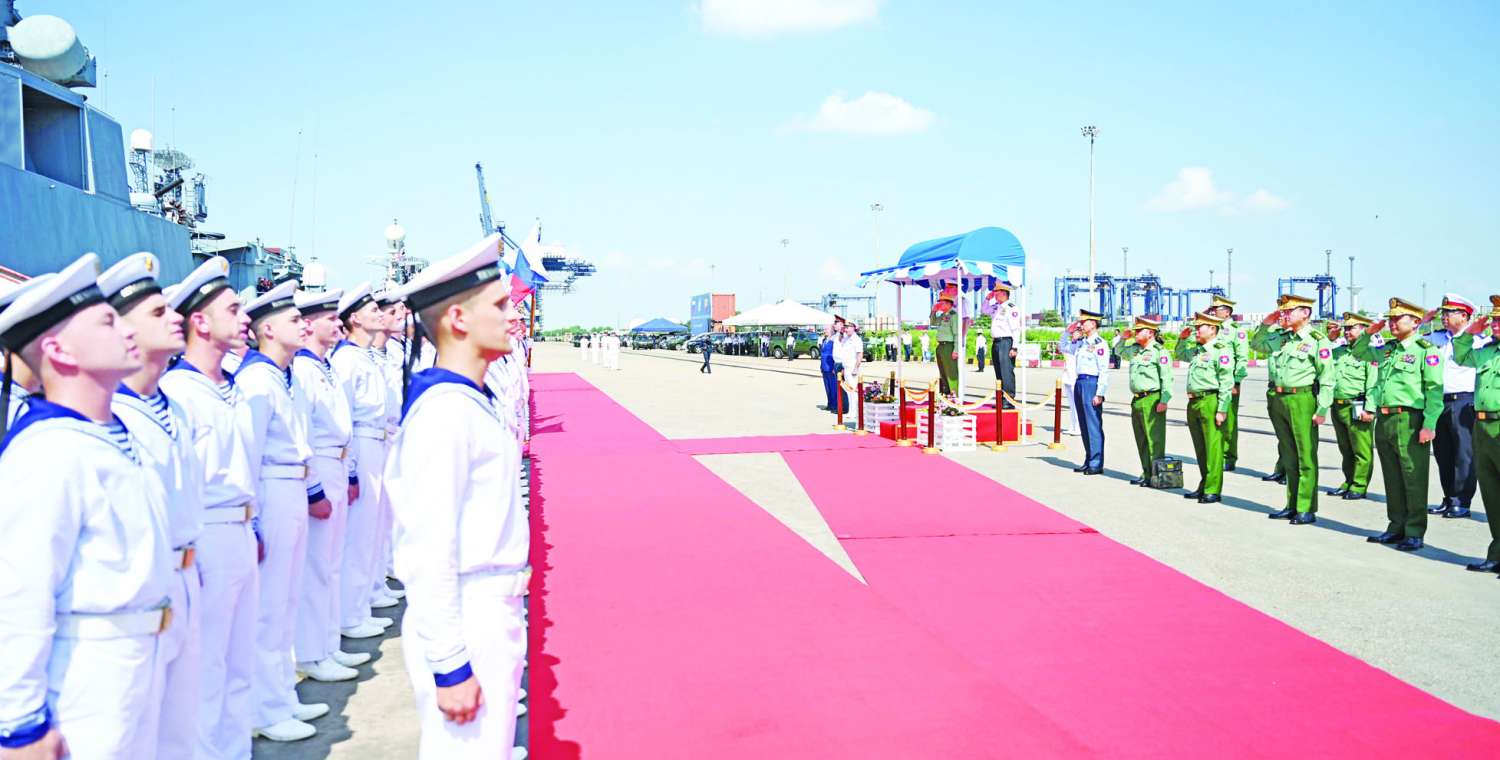 ထို့နောက် နိုင်ငံတော်စီမံ အုပ်ချုပ်ရေးကောင်စီ ဥက္ကဋ္ဌ တပ်မတော်ကာကွယ်ရေးဦးစီးချုပ်သည် ဂုဏ်ပြုတပ်ဖွဲ့အား စစ်ဆေးပြီး Russian Pacific Fleet စစ်ရေယာဉ်အုပ်စုမှ ဂုဏ်ပြုတပ်ဖွဲ့၏ နှစ်နိုင်ငံနိုင်ငံတော်တေးသီချင်း ဖြင့် ဂုဏ်ပြုကြိုဆိုအလေးပြုခြင်းကို ခံယူသည်။