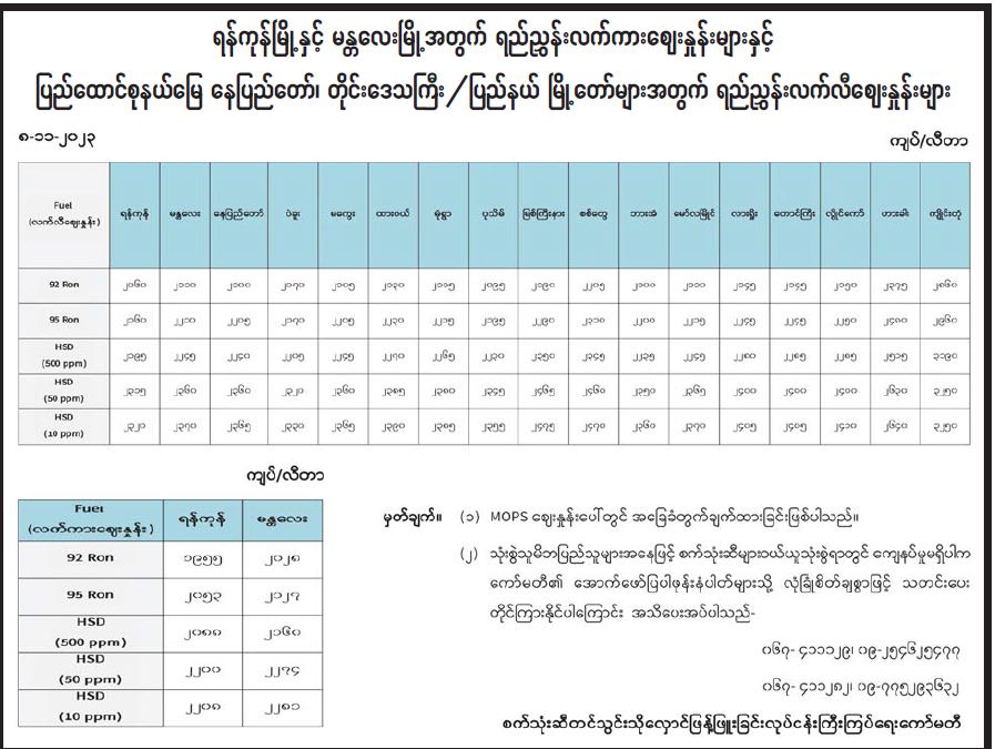 ရန်ကုန်မြို့နှင့် မန္တလေးမြို့အတွက် ရည်ညွှန်းလက်ကားဈေးနှုန်းများနှင့် ပြည်ထောင်စုနယ်မြေ နေပြည်တော်၊ တိုင်းဒေသကြီး/ပြည်နယ် မြို့တော်များအတွက် ရည်ညွှန်းလက်လီဈေးနှုန်းများ 11/08/2023