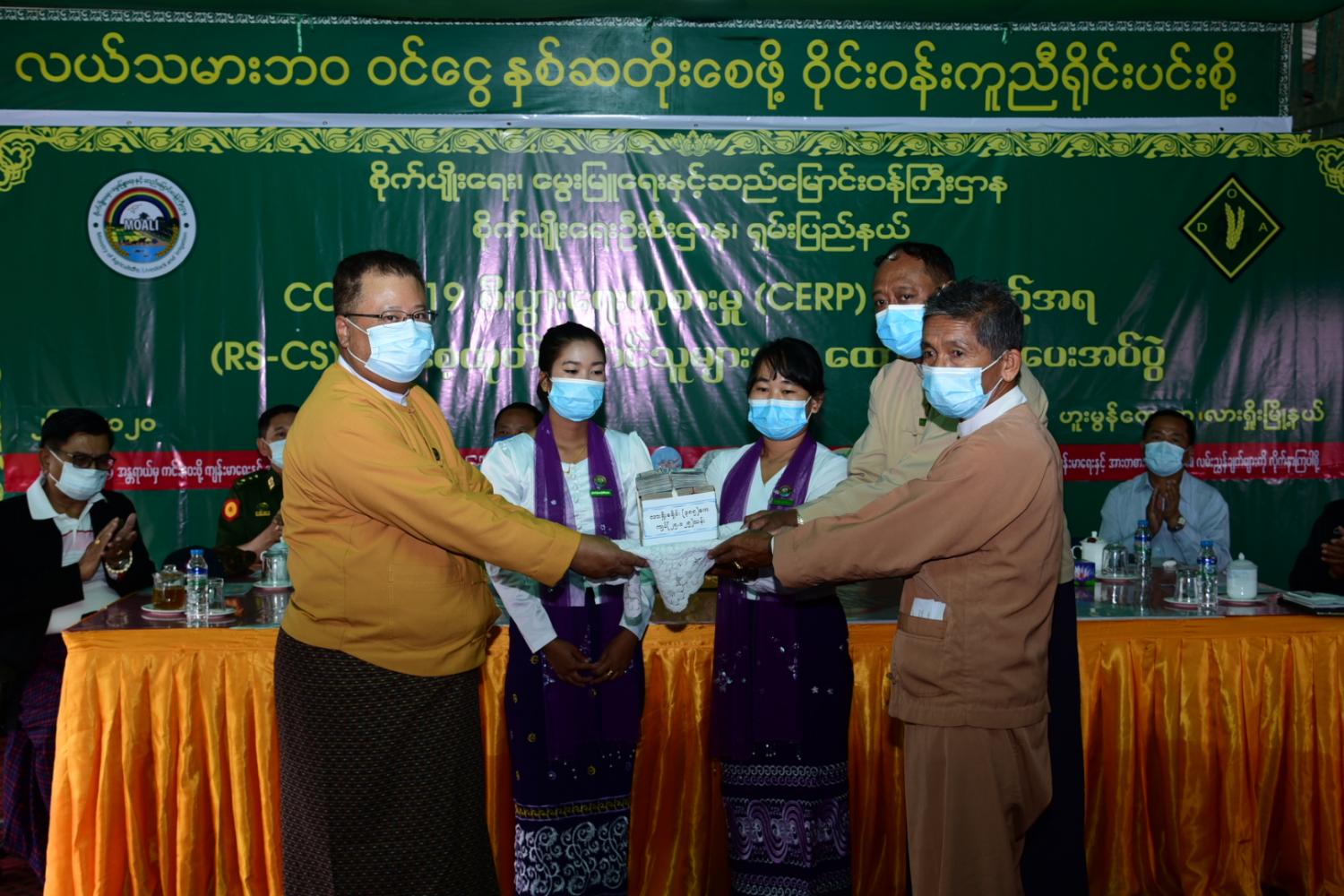 GOVID-19 စီးပွားရေးကုစားမှုအစီအစဉ် CERP ဖြင့် ရှမ်းပြည်နယ်(မြောက်ပိုင်း) အတွင်း Rs-Cs မျိုးသန့် မျိုးစေ့ထုတ် စိုက်ပျိုးမည့် တောင်သူများအား ဒုတိယအရစ် ထောက်ပံငွေပေးအပ်ခြင်းကို ယနေ့ နံနက်(၉) နာရီခွဲ က လားရှိုးမြို့ ဟူးမွန်ကျေးရွာ ရှင်းလင်းဆောင်ခန်းမ၌ ကျင်းပကြောင်း သိရှိရသည်။