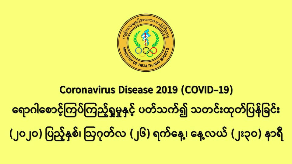 • COVID-19 ရောဂါ ဓာတ်ခွဲအတည်ပြုလူနာသစ် စုစုပေါင်း (၁၀၀) ဦး တွေ့ရှိရပါသည်။ (ဓာတ်ခွဲ အတည်ပြုလူနာသစ် (၃၀) ဦးတွေ့ရှိကြောင်းအား (၂၅-၈-၂၀၂၀) ရက်နေ့၊ ည (၈:၃၀)နာရီ သတင်းတွင် ဖော်ပြပြီးဖြစ်ပါသည်။)