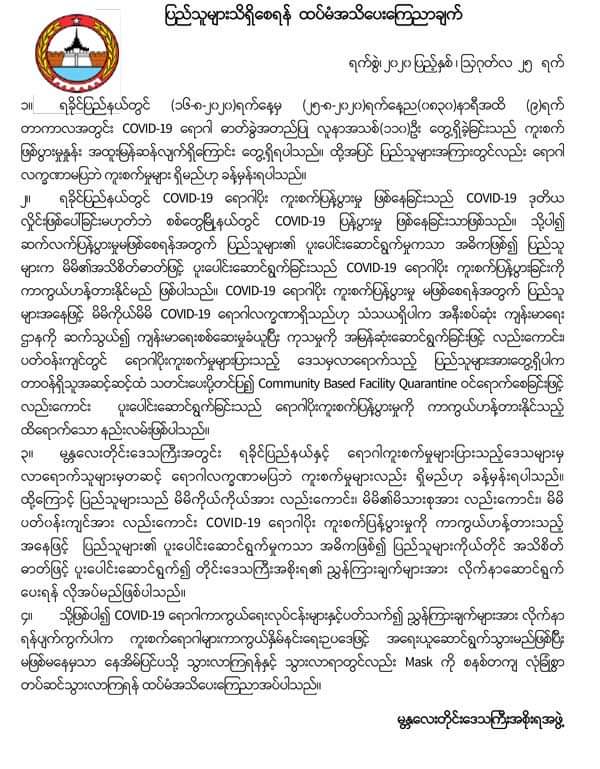 ထို့အပြင် COVID-19 ရောဂါ ကာကွယ်ရေးလုပ်ငန်းများနှင့်ပတ်သက်၍ ညွှန်ကြားချက်များအား လိုက်နာရန် ပျက်ကွက်ပါက ကူးစက်ရောဂါများ နှိမ်နင်းရေးဥပဒေဖြင့် အရေးယူဆောင်ရွက်သွားမည်ဖြစ်ပြီး မဖြစ်မနေမှသာ နေအိမ်အပြင်သို့ သွားလာကြရန်နှင့် သွားလာရာတွင်လည်း Mask ကို စနစ်တကျလုံခြုံစွာ တပ်ဆင်သွားလာရန် ထုတ်ပြန်ကြေညာထားသည်။