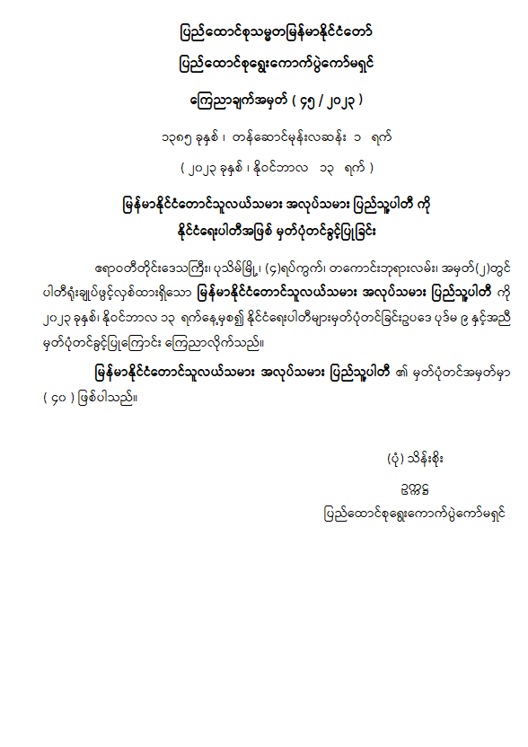မြန်မာနိုင်ငံတောင်သူလယ်သမားအလုပ်သမားပြည်သူ့ပါတီကို နိုင်ငံရေးပါတီအဖြစ် မှတ်ပုံတင်ခွင့်ပြုခြင်း 11/13/2023