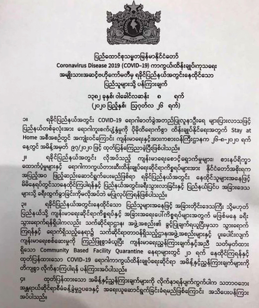Coronavirus Disease 2019 (COVID-19) ကာကွယ်၊ ထိန်းချုပ်၊ ကုသရေး အမျိုးသားအဆင့် ဗဟိုကော်မတီမှ ရခိုင်ပြည်နယ်အတွင်း နေထိုင်သော ပြည်သူများသို့ ပန်ကြားချက်ကို ယနေ့ရက်စွဲဖြင့် ထုတ်ပြန်