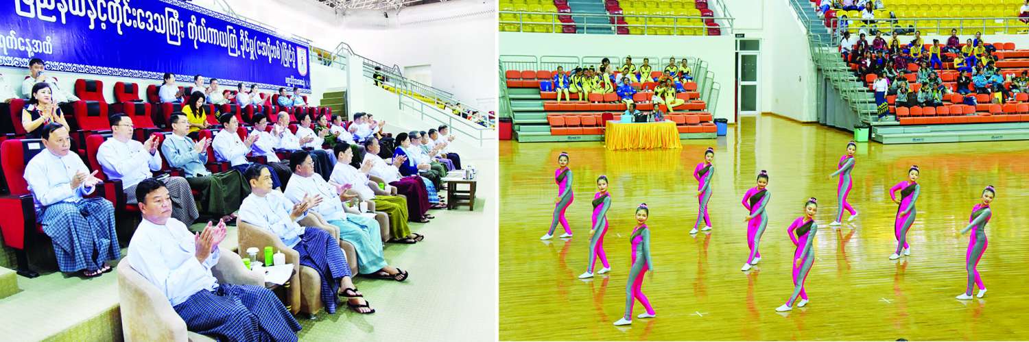 ၂၀၂၃ ခုနှစ် ပြည်နယ်နှင့်တိုင်းဒေသကြီး အမျိုးသမီးကိုယ်ကာကြံ့ခိုင်မှုလေ့ကျင့်ခန်း (အေရိုးဗစ်) ပြိုင်ပွဲဖွင့်ပွဲအခမ်းအနားကို ယနေ့ နံနက် ၉ နာရီတွင် နေပြည်တော်ရှိ ဝဏ္ဏသိဒ္ဓိအားကစားရုံ (A) ၌ ကျင်းပရာ နိုင်ငံတော်စီမံအုပ်ချုပ်ရေးကောင်စီအဖွဲ့ဝင်များ တက်ရောက်ကြည့်ရှုအားပေးကြသည်။