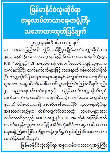 အကြမ်းဖက်အုပ်စုအဖြစ် ကြေညာထားသော CRPH ၊ NUG နှင့် ၎င်းတို့၏ လက်ဝေခံများ၏ လှုံ့ဆော်၊ ဝါဒဖြန့်ခြင်းများအား လိုက်ပါလုပ်ဆောင်ခြင်း၊ အားပေးကူညီခြင်းများ ပြုလုပ်ခဲ့သူများအား ဖော်ထုတ်အရေးယူ