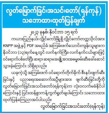 လွတ်မြောက်ခြင်းအသင်းတော်(ရန်ကုန်) သဘောထားထုတ်ပြန်ချက်