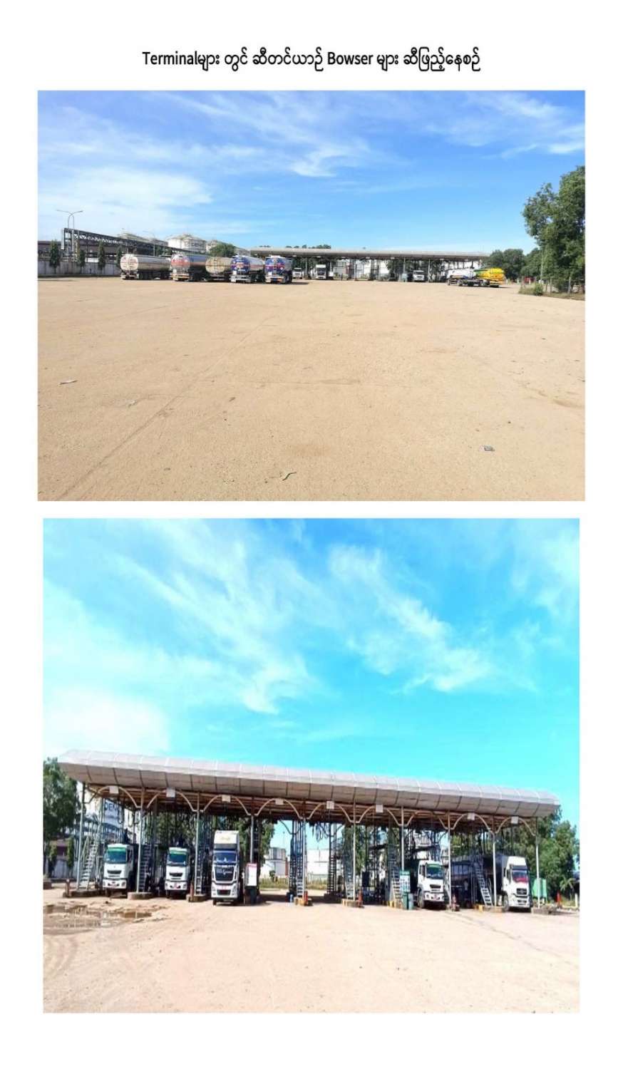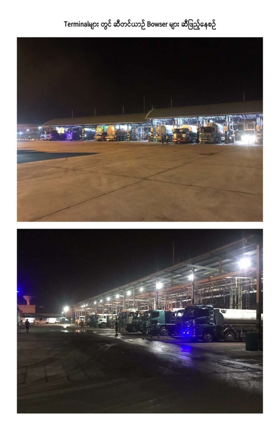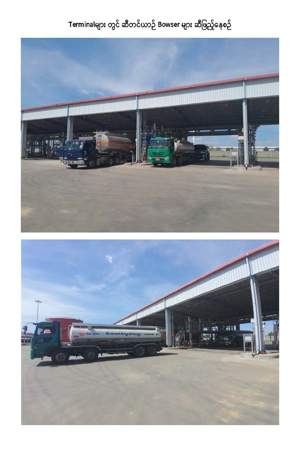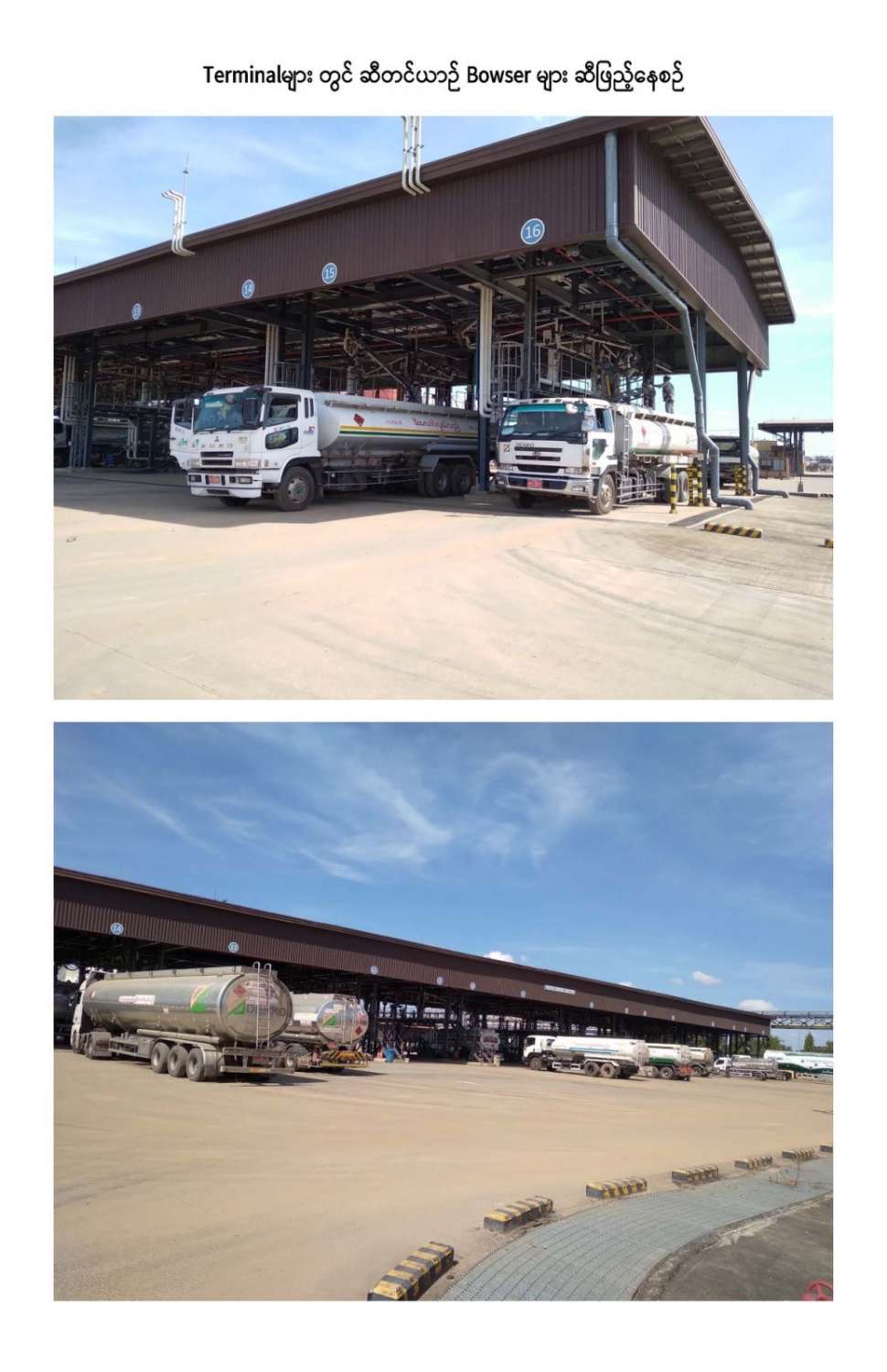 ရန်ကုန်သီလဝါဆိပ်ကမ်းဒေသကြီးရှိ စက်သုံးဆီ Terminal များသို့ ပြည်ပမှ စက်သုံးဆီတင်သင်္ဘောများ အဆက်မပြတ်ရောက်ရှိပြီး စက်သုံးဆီများဖြည့်တင်းလျက်ရှိရာ သီလဝါဆိပ်ကမ်းဒေသကြီးရှိ Denko Terminal ၊ Max Terminal ၊ MMTM Terminal ၊ Brighter Energy Terminal ၊ PSW Terminal ၊ Regency SPC Terminal များအပြင် သာကေတမြို့နယ်ရှိ PT Power Terminal နှင့် လှိုင်သာယာမြို့နယ်ရှိ Denko Terminal တို့မှ ၁၅-၁၁-၂၀၂၃ ရက်နေ့တွင် ရန်ကုန်တိုင်းဒေသကြီးအတွင်းရှိ အရောင်းဆိုင်(၁၈၇) ဆိုင်သို့ ဆီသယ်ယာဉ် (၃၆၇)စီးဖြင့် 92 Ron(၄သိန်းကျော်)၊ 95Ron (၂သိန်း၄သောင်းကျော်)၊ ဒီဇယ်ဆီ (၃သိန်း၂သောင်းကျော်)၊ ပရီမီယမ်ဒီဇယ်ဆီ(၃သိန်း၅သောင်းကျော်)အား လည်းကောင်း၊ နိုင်ငံတစ်ဝှမ်းရှိ စက်သုံးဆီအရောင်းဆိုင် (၂,၁၇၈) ဆိုင်သို့ ဆီသယ်ယာဉ် (၉၂၈) စီးဖြင့် 92 Ron (၁သန်း၂သိန်းကျော်)၊ 95Ron (၂ သိန်း ၅ သောင်းကျော်)၊ ဒီဇယ်ဆီ (၇သိန်းကျော်)၊ ပရီမီယမ်ဒီဇယ်ဆီ (၁ဝသိန်းကျော်)အားလည်းကောင်း နေ့ညမရွေး အဆက်မပြတ်ဖြည့်တင်း သယ်ယူပို့ဆောင်ဖြန့်ဖြူးလျက်ရှိသဖြင့် နိုင်ငံတစ်ဝှမ်းရှိ အရောင်းဆိုင်အားလုံးတွင် စက်သုံးဆီလာရောက် ဝယ်ယူမှုအခြေအနေမှာ ပုံမှန်အတိုင်းဖြစ်ပြီး အများပြည်သူများမှ စက်သုံးဆီများကို အမျိုးအစားအလိုက် လိုအပ်သလို အဆင်ပြေချောမွေ့စွာဝယ်ယူ သုံးစွဲလျက်ရှိကြောင်း သတင်းရရှိပါသည်။