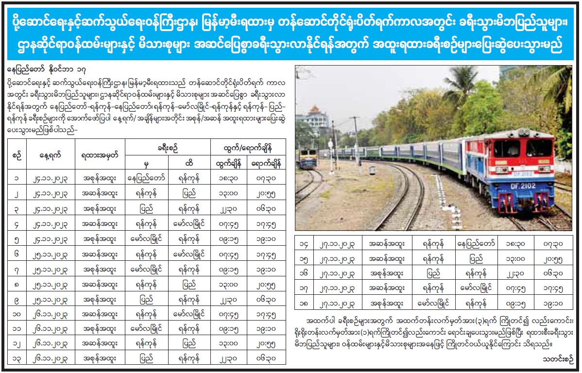 ပို့ဆောင်ရေးနှင့်ဆက်သွယ်ရေးဝန်ကြီးဌာန၊ မြန်မာ့မီးရထားမှ တန်ဆောင်တိုင်ရုံးပိတ်ရက်ကာလအတွင်း ခရီးသွားမိဘပြည်သူများ၊ ဌာနဆိုင်ရာဝန်ထမ်းများနှင့် မိသားစုများ အဆင်ပြေစွာခရီးသွားလာနိုင်ရန်အတွက် အထူးရထားခရီးစဉ်များ ပြေးဆွဲပေးသွားမည် 11/18/2023