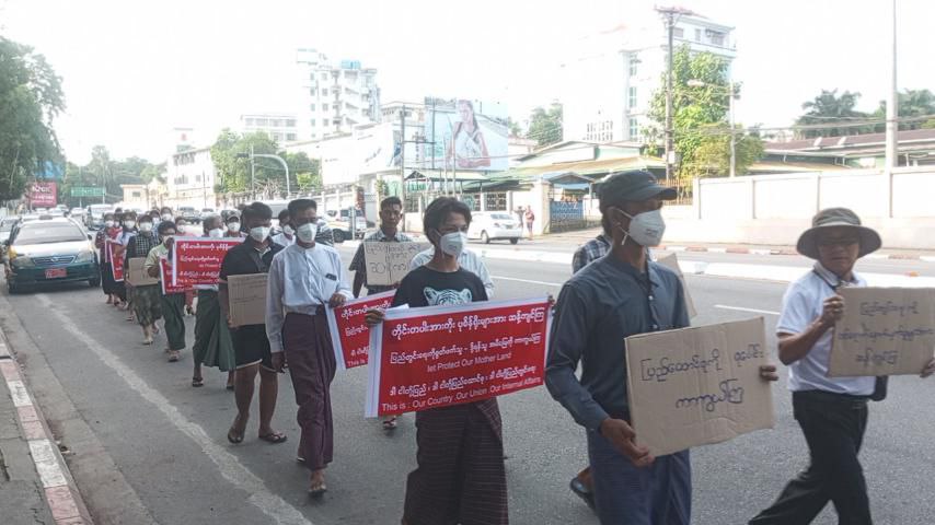 အမျိုးသားရေးလှုပ်ရှားသူများ ဦးဆောင်ဆန္ဒဖော်ထုတ်ရာတွင် မြန်မာပြည်တဝှမ်းမှာ ငြိမ်းချမ်းရေးပန်းများ ပွင့်လန်းပါစေ၊ အကြမ်းဖက်လုပ်ရပ်တွေ - ချက်ချင်းရပ်၊ တိုင်းတပါးအားကိုး ပုဆိန်ရိုးများအား -ဆန့်ကျင်ကြ၊ ပြည်တွင်းရေးကို စွက်ဖက်သူ-ဒို့ရန်သူ၊ အမိမြေကိုကာကွယ်ကြ (let protect our mother land)၊ ဒါ ငါတို့ပြည် ဒါငါတို့ပြည်ထောင်စု ဒါငါတို့ပြည်တွင်းရေး၊ This is : Our Country, Our Union, Our Internal affairs၊ အချုပ်အခြာကို ထိပါးလာသူမှန်သမျှ - ဆန့်ကျင်ကြ၊ အပြစ်မဲ့ပြည်သူများကို အတိဒုက္ခရောက်စေသော အကြမ်းဖက်လုပ်ရပ်များအား - ဆန့်ကျင်ကြပိုစတာများ ကိုင်ဆောင်၍ ကြွေးကြော်ပြီး ညနေ ၄ နာရီခွဲတွင်ပြီးဆုံးကာ ပြန်လည်ထွက်ခွာသွားကြောင်း သိရသည်။