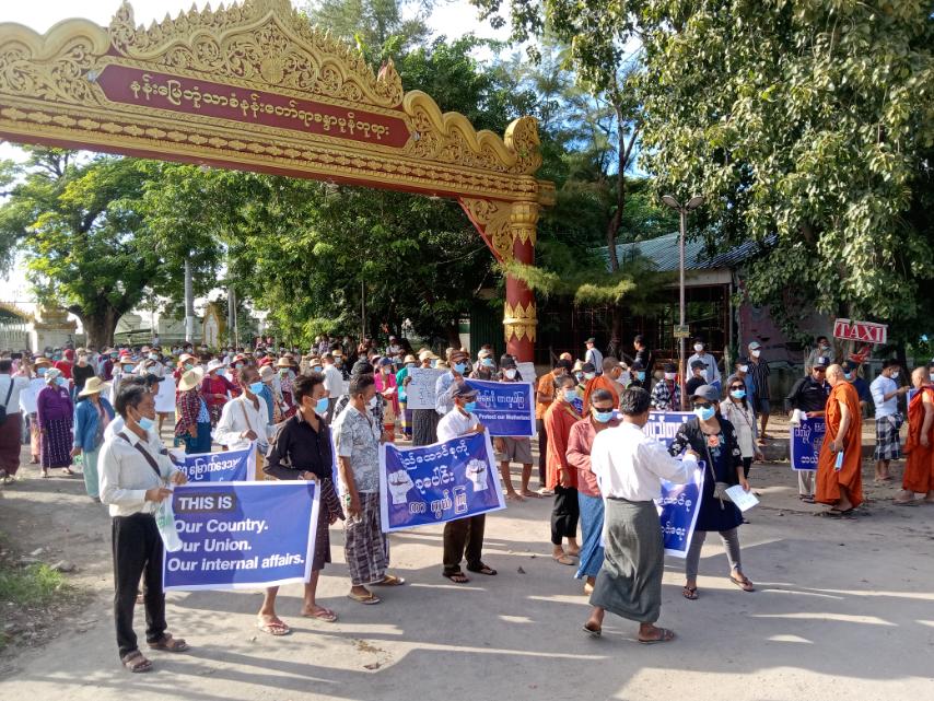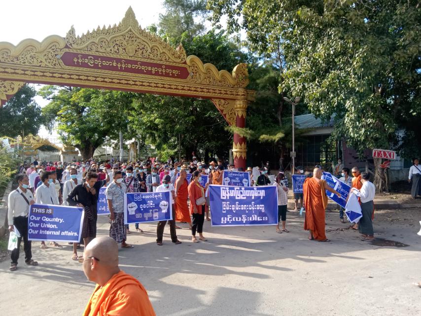 အဆိုပါရှုတ်ချဆန္ဒထုတ်ဖော်ပွဲကို အမျိုးသားရေးဦးဆောင်ဆရာတော် ဉူးစန္ဒာသီရိ ဦးဆောင်သည့် သံဃာတော်များနှင့် ပြည်သူအင်အား ၂၀၀ ဦးခန့်တို့က ပြုလုပ်ခဲ့ကြခြင်းဖြစ်ပြီး "ပြည်ထောင်စုကို စုပေါင်းကာကွယ်ကြ၊ Our Country, Our Union, Our internal affairs ၊ ဒါငါတို့ တိုင်းပြည်၊ ဒါငါတို့ ပြည်ထောင်စု၊ ဒါငါတို့ ပြည်တွင်းရေး၊ အမိမြေကို ကာကွယ်ကြ (Let's Protect Our Motherland)၊ အရှေ့မြောက်ဒေသမှာ ငြိမ်းချမ်းရေးပန်းတွေ ပွင့်လန်းပါစေ၊ ငါတို့ရဲ့ ပြည်တွင်းရေးကို စွက်ဖက်နေတာ ဘယ်သူလဲ၊ မျိုးချစ်လူငယ်ကာကွယ်ရေးအဖွဲ့၊ အမိမြေကို ကာကွယ်ကြ၊ ပြည်တွင်းရေးကို ဝင်ရောက်စွက်ဖက်နှောင့်ယှက်သူများအား ဆန့်ကျင်ကြ၊ ပြည်ထောင်စုပြိုကွဲမည့်အကြံ ဒို့လက်မခံ" စသည့် စာသားများပါ ဗွီနိုင်းဆိုင်းဘုတ်များ ကိုင်ဆောင်၍ "ပြည်တွင်းရေးကို ဝင်ရောက်စွက်ဖက်သူ ဒို့ရန်သူ ၊ ပြည်ထောင်စုကို ဖြိုခွဲမည့်အကြံ-ဒို့လက်မခံ၊ အကြမ်းဖက်အဖွဲ့အစည်းများကို ပံ့ပိုးပေးနေသူ ဒို့ရန်သူ၊ ပြည်ပအားကိုး ပုဆိန်ရိုးများ အလိုမရှိ၊ မြန်မာပြည်တဝှမ်းမှာ ငြိမ်းချမ်းရေးပန်းများ - ပွင့်လန်းပါစေ" စသည်ဖြင့် ကြွေးကြော်ရှုတ်ချ ဆန္ဒထုတ်ဖော်ခဲ့ကြကြောင်း သတင်းရရှိသည်။