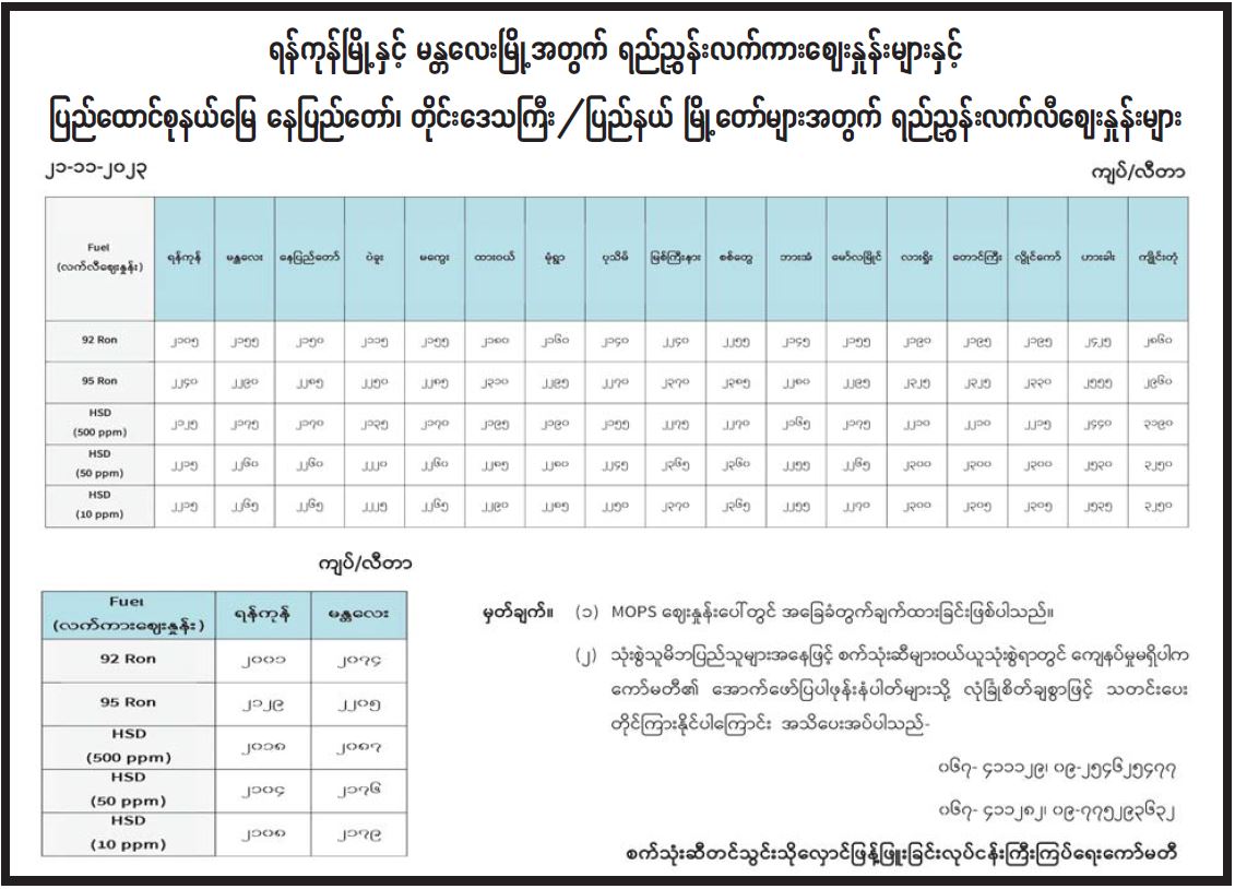 ရန်ကုန်မြို့နှင့် မန္တလေးမြို့အတွက် ရည်ညွှန်းလက်ကားဈေးနှုန်းများနှင့် ပြည်ထောင်စုနယ်မြေ နေပြည်တော်၊ တိုင်းဒေသကြီး/ ပြည်နယ် မြို့တော်များအတွက် ရည်ညွှန်းလက်လီဈေးနှုန်းများ 11/21/2023